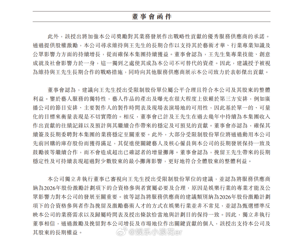 乐华寻求与王一博的长期合作 在乐华娱乐25日公开的董事会函件中提到,公司建议向王一博授出股份:旨在认可及奖励其对集团业务做出的卓越贡献,寻求维持与王一博的长期合作。董事会认为,挽留王一博带来的长期稳定性及可持续表现超过对少数股东的最小摊薄影响,更好符合全体股东的整体利益。