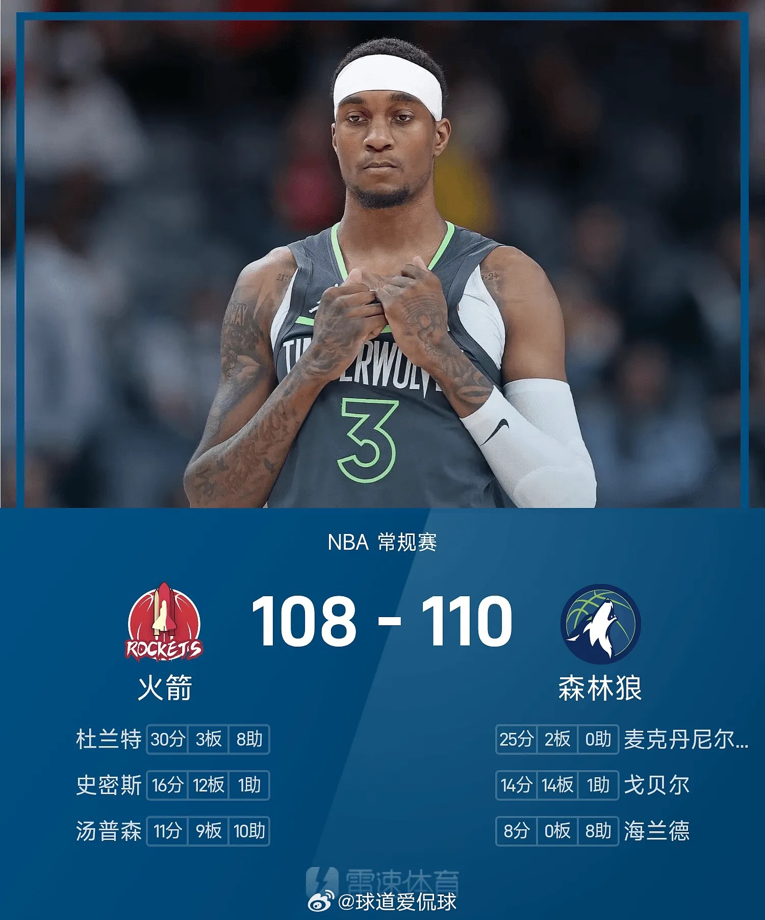 比赛过程跌宕起伏,森林狼在末节一度领先11分遭到火箭的顽强反扑,麦丹还伤退。