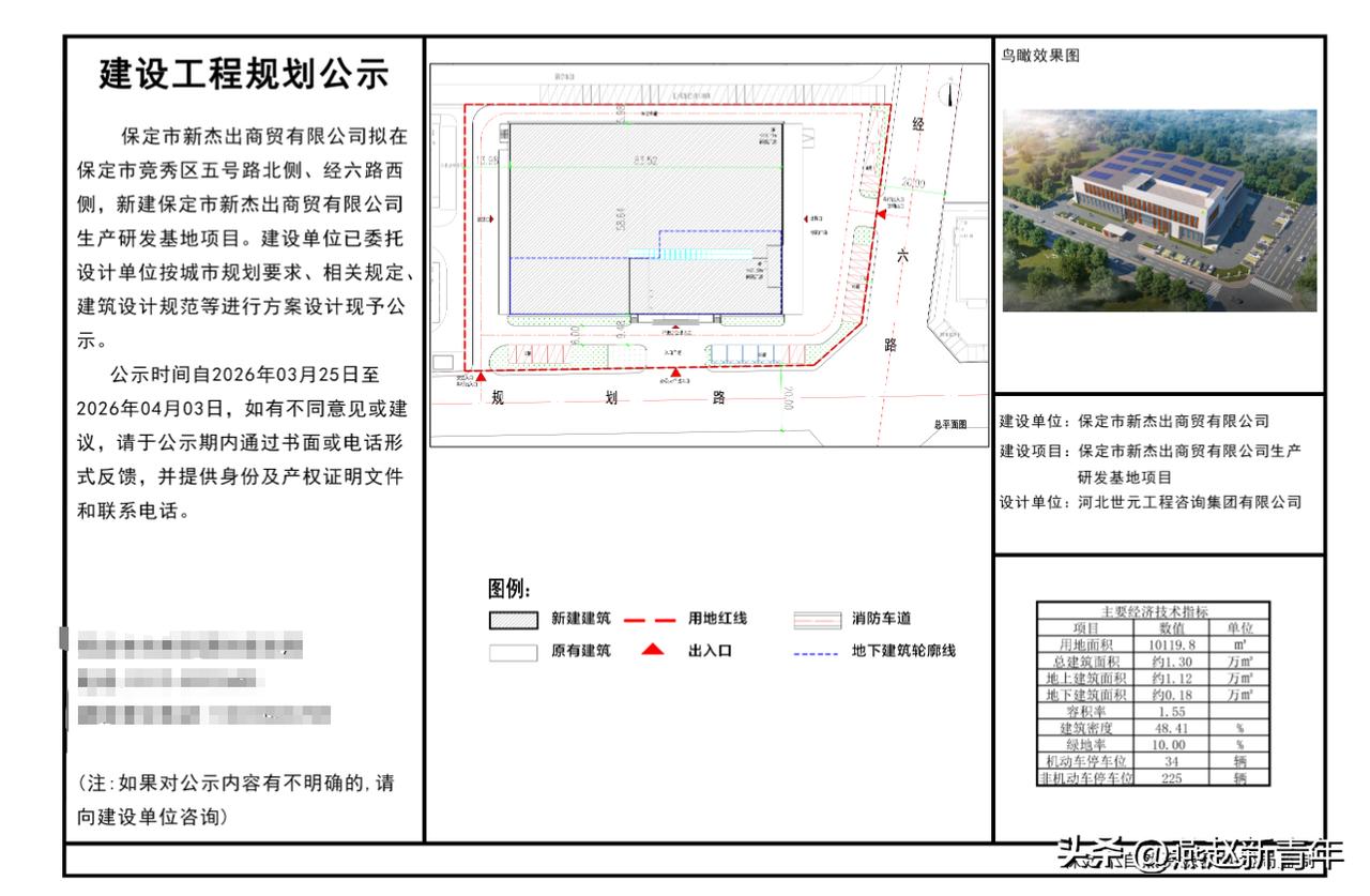 约15.18亩!保定市新杰出商贸有限公司生产研发基地!保定市新杰出商贸有限公司拟在保定市竞秀区五号路北侧、经六路西侧,新建保定市新杰出商贸有限公司生产研发基地项目