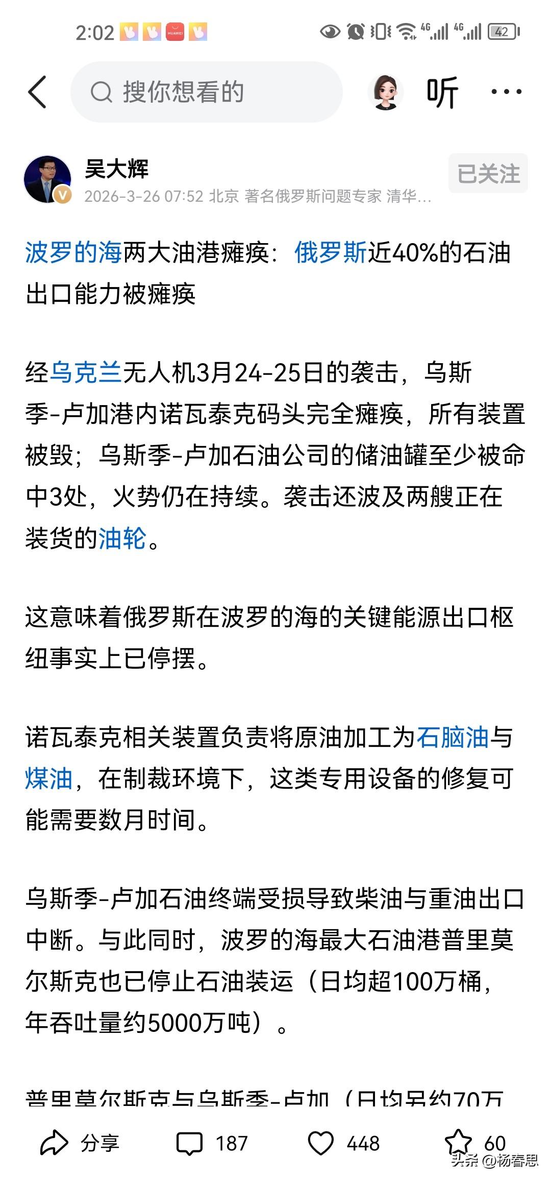伊朗战场激战正酣,乌克兰与俄罗斯的战场并没停下来,乌克兰从以色列学坏了,专打俄罗斯的石油基础设施了。经过几天的无人机打击,波罗的海两大油港瘫痪,俄罗斯近40%的石油出口能力被瘫痪。俄罗斯好不容易由于伊朗战争带来的暂时红利可能又终止了。