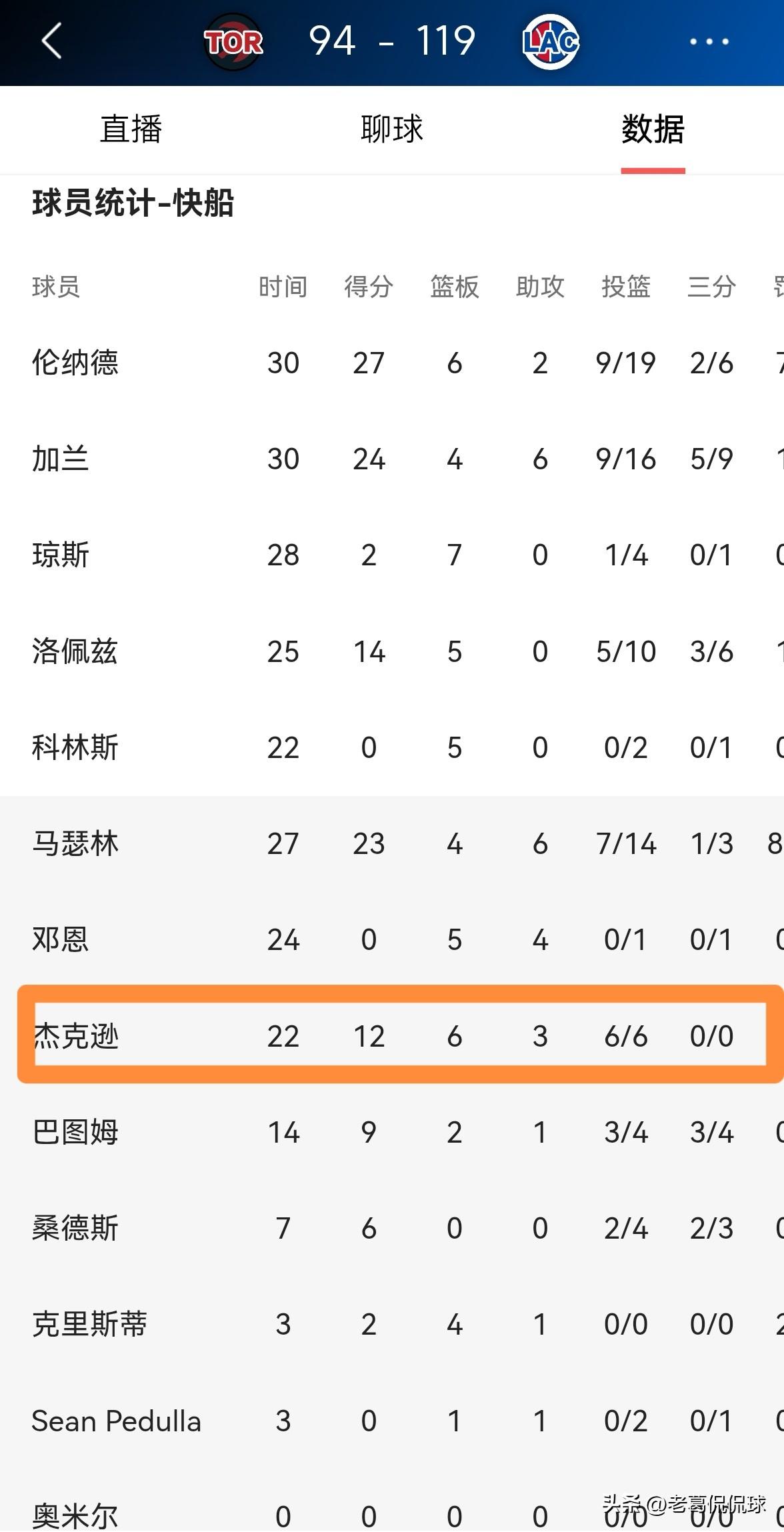 快船悍将杰克逊真是越来越如鱼得水了!在今天快船主场以119:94轻取猛龙的比赛中,杰克逊不仅在进攻端打出了极其高效的表现,而且在防守端为球队提供了非常大的帮助。 全场比赛下来,杰克逊替补出战22分钟,投篮6中6极其高效的砍下12分,还有6篮板3助攻1抢断2盖帽,他的场上正负值为+15。 坦白说,如今杰克逊已然成为了球队替补阵容的核心球员之一,他在球队的攻防体系中越来越如鱼得水了。