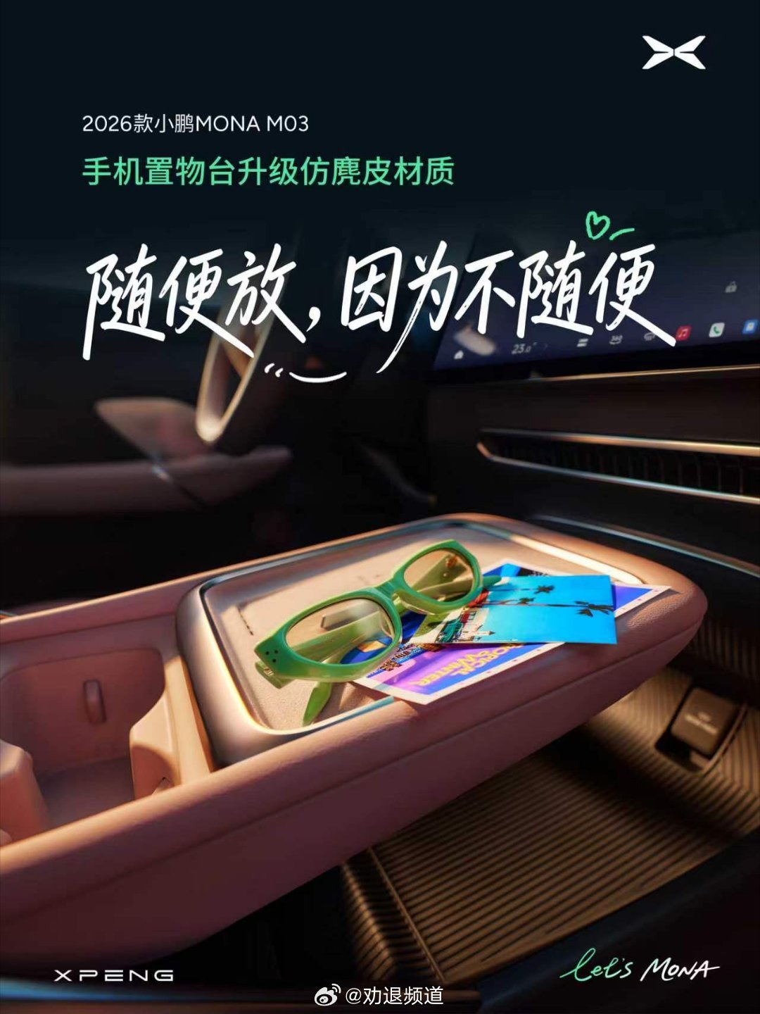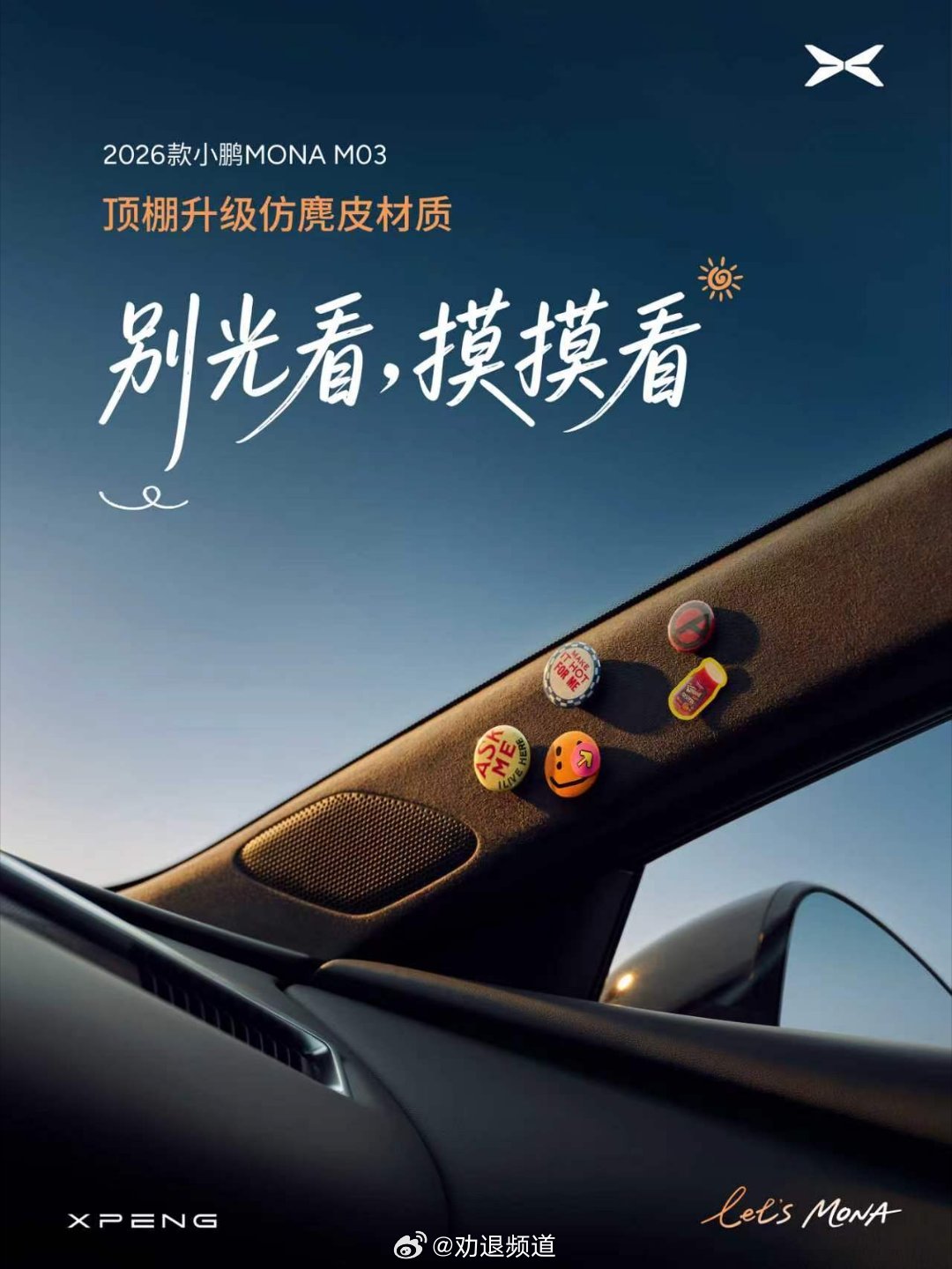 外观用上新车漆、新包围、新轮毂等等,更耐看也更显运动。内饰软包面积增加,顶棚和手机置物台也都用上仿麂皮材质,还有全金属的音响罩,看着高级,摸着也舒服。作为很多年轻人的第一台车,精致感这块安排到位了~2026款小鹏MONA外观内饰更精致