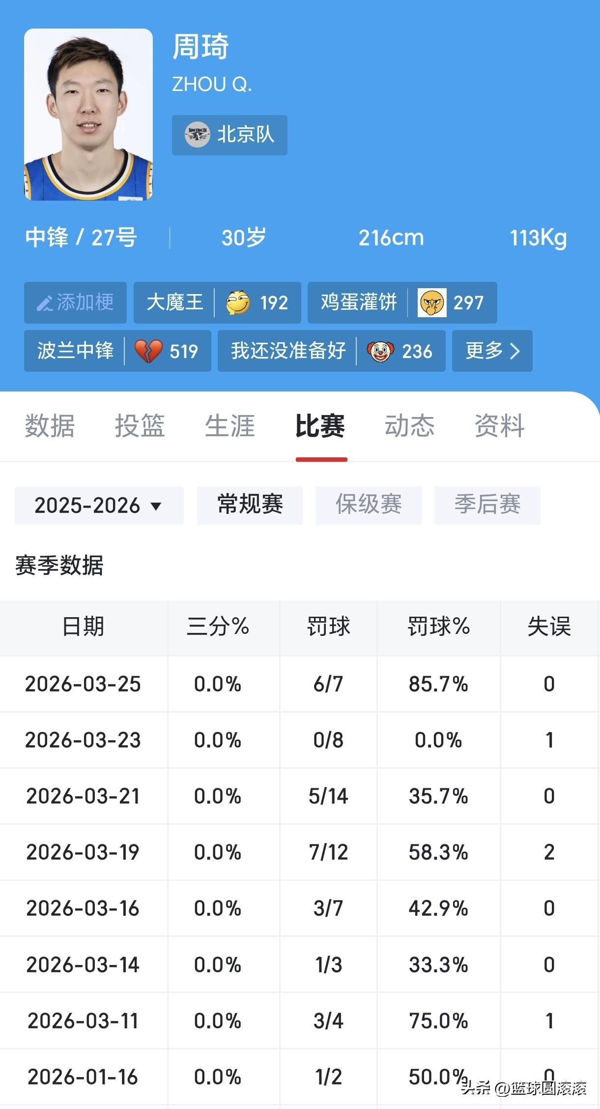 谁能想到,那个曾在关键时刻罚篮连续失手的周琦,如今竟成了北京队最稳的罚球手? 看看这组数据对比,简直是脱胎换骨: - 3月23日:8罚0中,罚球命中率0%,赛后被骂上热搜 - 3月25日:7罚6中,命中率高达85.7%,0失误,用罚球帮球队稳住局势 这哪里是技术进步,分明是心态和态度的彻底蜕变! 还记得3月23日那场比赛吗?周琦站在罚球线,连续8次出手全部偏出,镜头里他低着头,眼神里满是自责。球迷们翻出他过往的罚球数据:3月21日14罚5中(35.7%)、3月19日12罚7中(58.3%),波动大到让人揪心,甚至有人调侃他“罚球比扣篮还难”。 可仅仅两天后,他就用一场完美的罚球表现打了所有人的脸。7次站上罚球线,6次稳稳命中,没有一次失误,连解说都忍不住感叹:“这还是我们认识的那个周琦吗?” 更让人动容的是,他在赛后采访里说:“罚篮丢了就是丢了,没借口,只能练。”据说那段时间,他每天加练200次罚球,从出手姿势到呼吸节奏,一点点抠细节,连队友都调侃他“吃饭睡觉都在练罚球”。 有人说,周琦的罚篮进步,只是偶然。可看看他戴着眼罩护具在场上拼抢的样子,看看他从0%到85.7%的逆袭轨迹,就知道这从来不是运气,而是日复一日的汗水堆出来的结果。 对于中国男篮来说,周琦的觉醒意义远不止一场比赛。他用行动证明:哪怕曾经跌倒谷底,只要肯沉下心打磨,就能重新站回巅峰。现在的他,不仅是北京队的内线屏障,更是中国男篮最可靠的定心丸。 从8中0到6中7,周琦用罚球完成了自我救赎。你觉得,他能把这种状态保持到季后赛吗?他会不会成为中国男篮冲击巴黎奥运会的关键先生?评论区聊聊你的看法👇