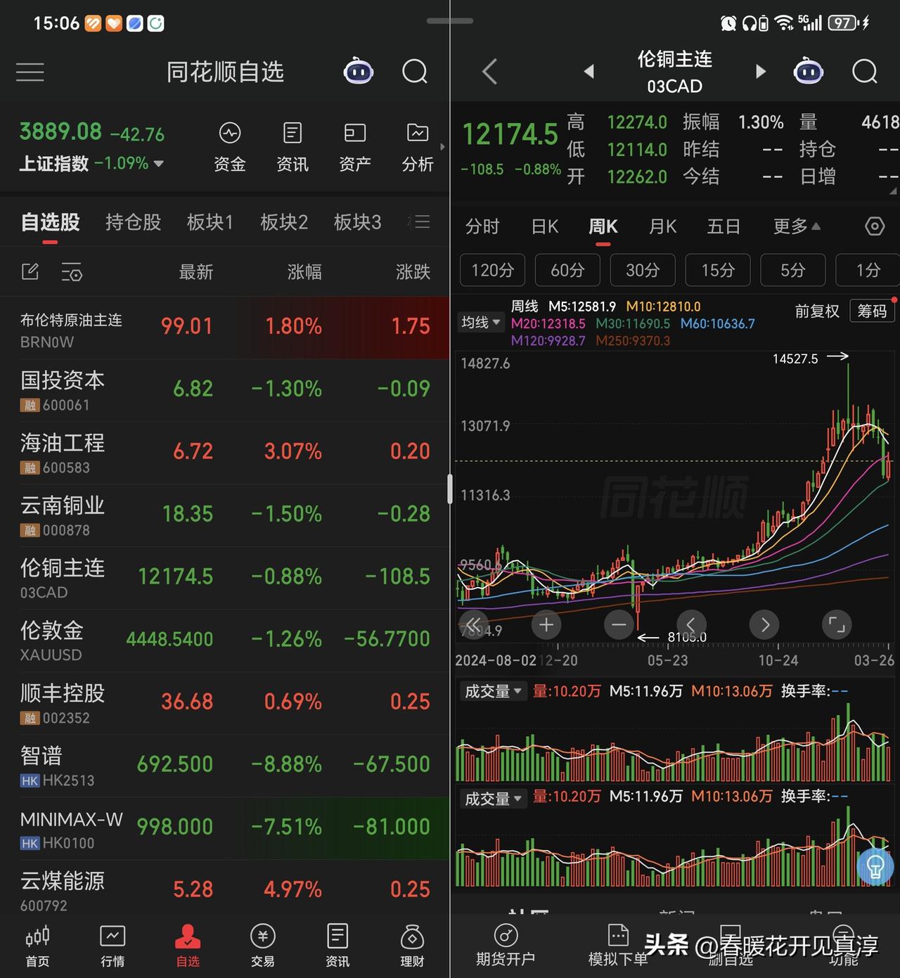 没有更新了,说一下最新的判断,券商到这里确实基本上差不多了,铜期货目前看是开始震荡,短时间之内估计不太容易结束。 原油呢,现在在百元附近,那么这个价位不可谓低,这种价位的保持有利于和原油的持有方有关的品种,对于以原油为原料的行业可能会构成一定的影响。 前几天好像看到一个说法,说高油价对我们的伟大复兴有利,具体逻辑我没有看。 哎呀,这个我觉得我反正是分辨不了。 反正我只知道,踩油门的时候多少有一点心理压力了。 还是之前的看法,多看少动,那么我们还是要去观察它相应的阶段,然后在保障整个账户安全的前提下采取相应动作,一定不要盲动。