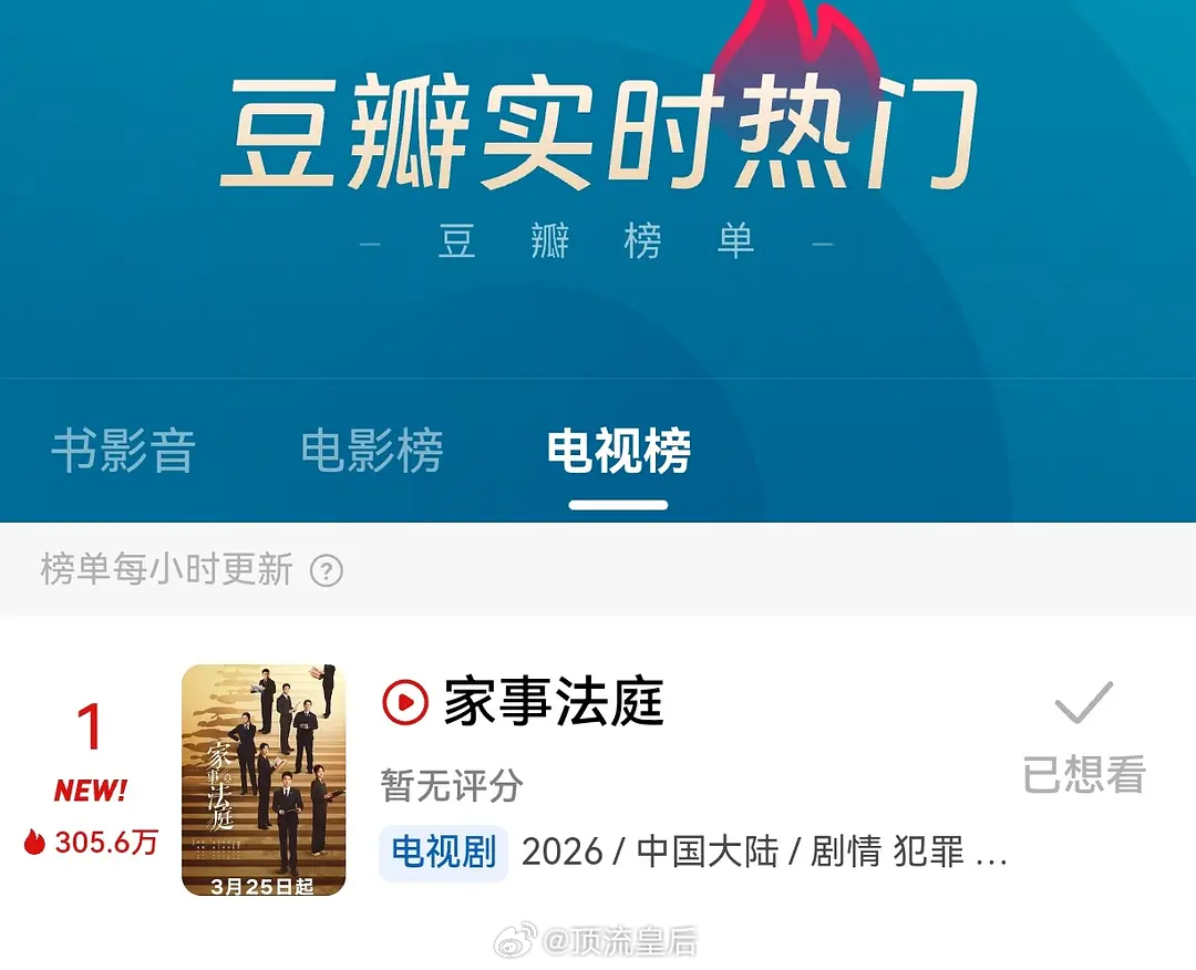 恭喜龚俊《家事法庭》2026年央一黄金档首日CVB第二名,收视率3.238%,豆瓣实时热门电视榜第一。