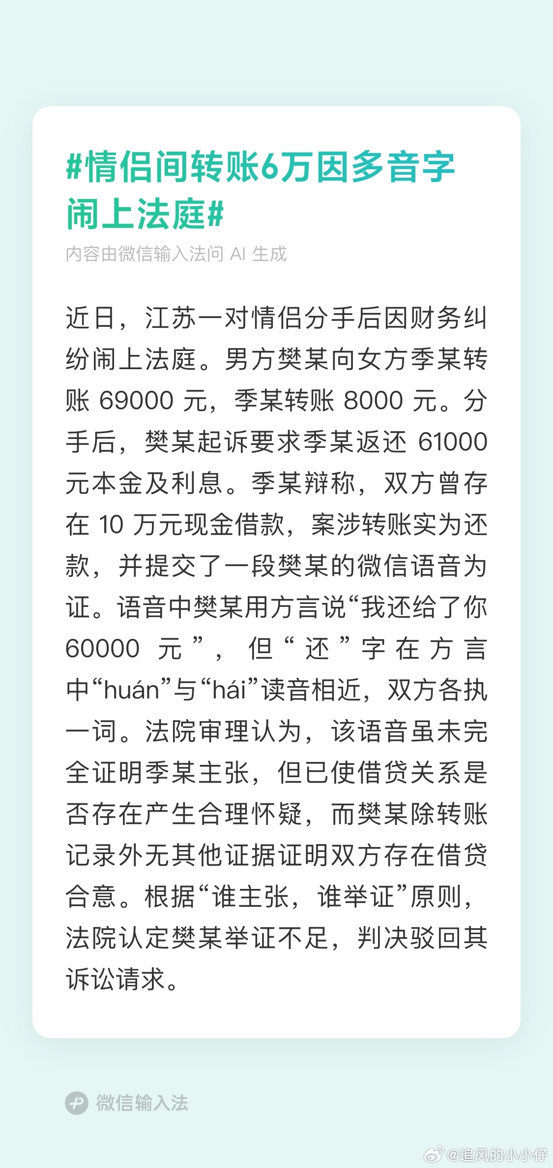 情侣间转账6万因多音字闹上法庭转账就转账,借款就借款,赠与就赠与。不要模糊其辞。