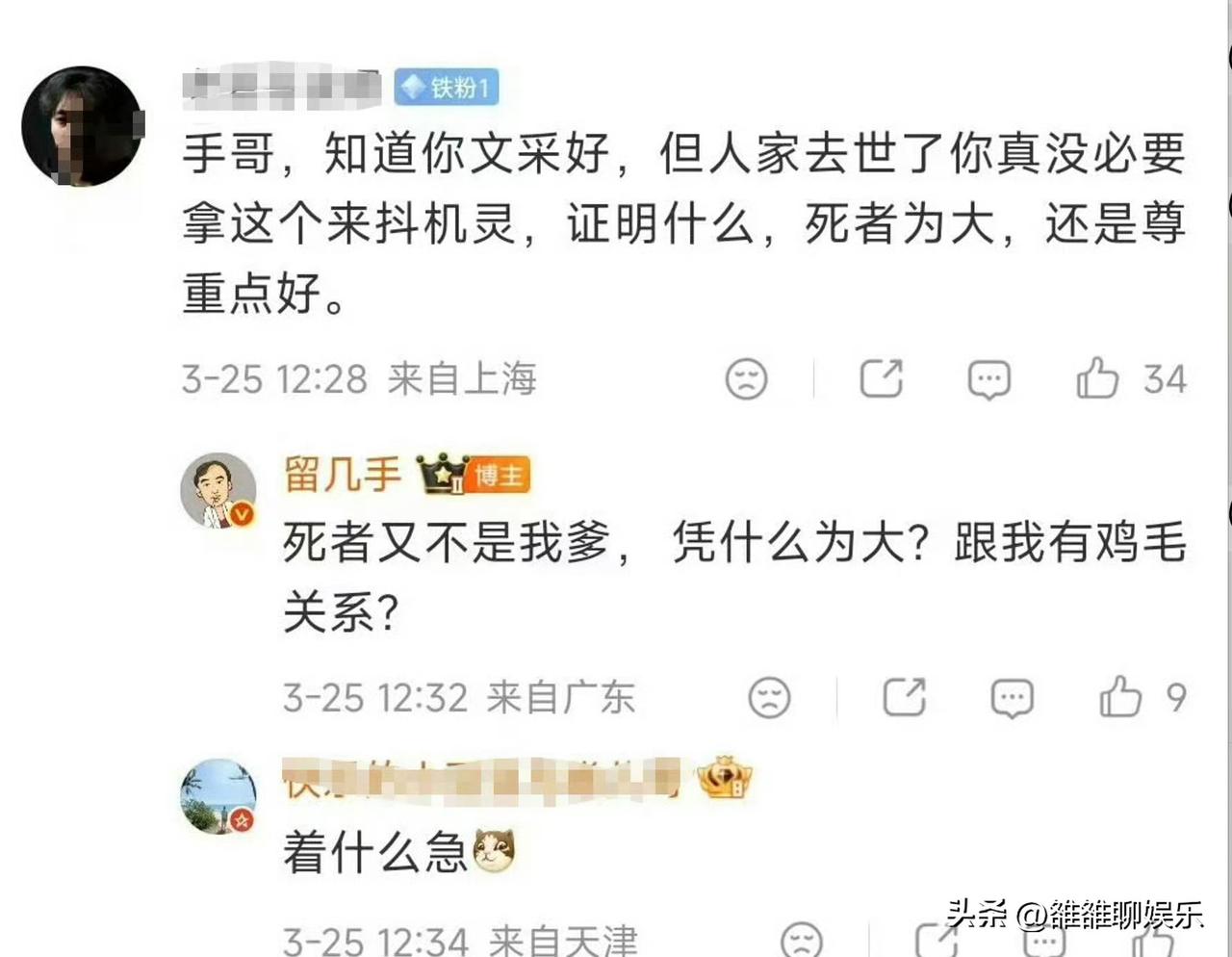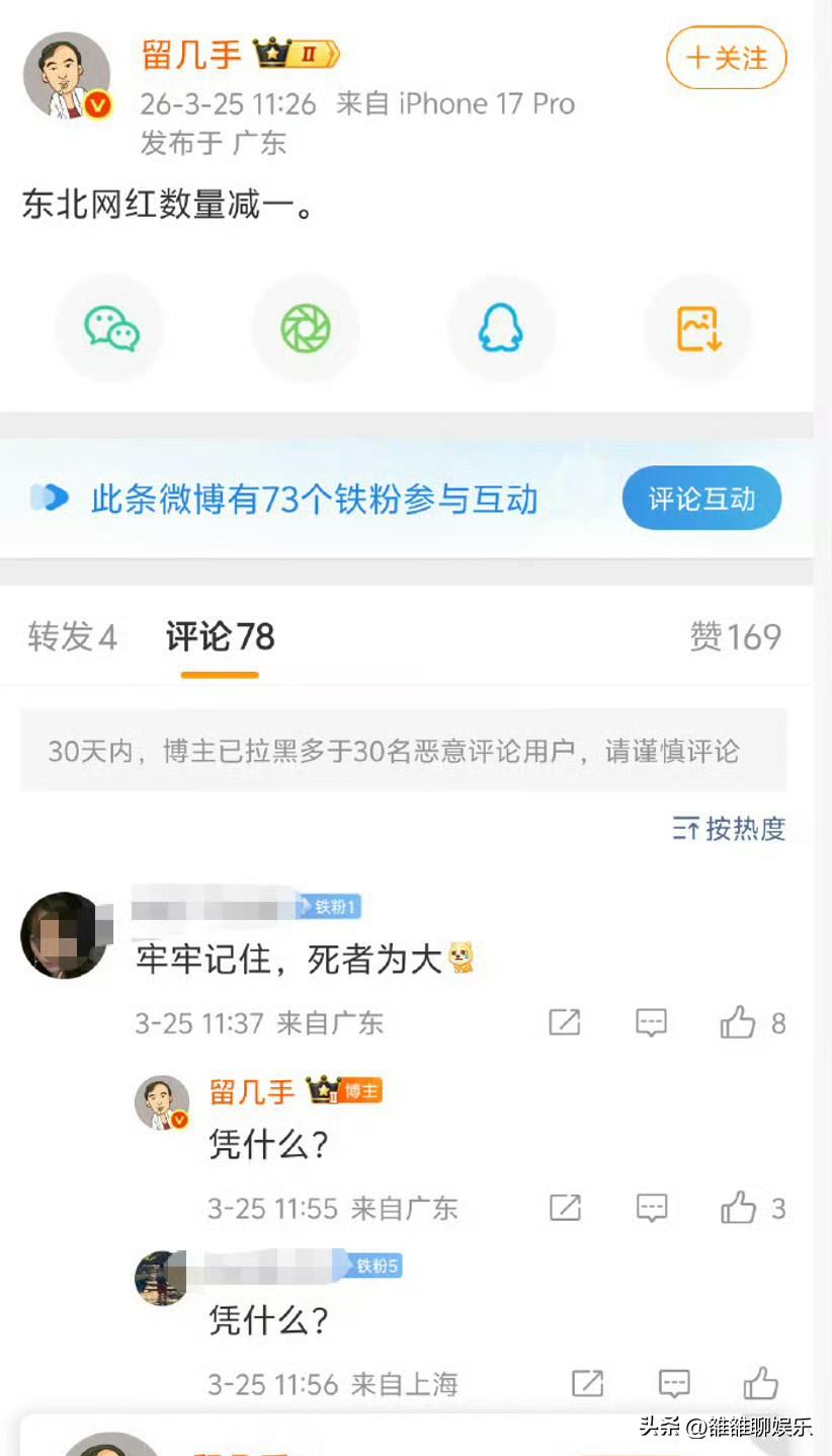 留几手,这是第二次被批评。 3月26号,千万网红留几手的微博被禁止关注了,消息一出,网友瞬间炸锅了:终于有人出手了。 但大家不知道的是,这已经是他第二次被批评,早在2013年时,人民日报就点名批评过他。 当时人民日报刊发了一篇文章《出名要有底线》,文章中各种怼他:“语言极尽污蔑调侃之能事”,“动辄爆粗口”,“几近人身攻击”。 2010年他以网名“留一手”加入豆瓣,凭借犀利刻薄的点评出圈,擅长贬低网友容貌,言语间充斥挖苦与粗口,甚至变成人身攻击,在他的语境里没有一个好人,他用这种“看似说真话”的风格获得流量。 2013年到2026年,整整十三年,尽管他被人划了红线,但他依然活跃,直到最近才被禁止关注,这是十三年里他从一个小网红,变成一个拥有千万粉丝的大V,依然靠“骂人”博眼球,他觉得这条路,自己走的挺顺当,以前黑红也是红,如今不一样了,你黑了就是黑了,不会在红了。 这一次留几手的发文,引来了众怒,平台也以禁止关注的方式给了他处理,他的粉丝一天内掉了十万。 不管张雪峰生前如何,但死者为大,他不应该用那么难听的话来说张雪峰,这体现了一个人的素质,留几手是真的没素质。 留几手不是第一个,也不是最后一个,那些还靠犀利语言吸粉的博主们,都应该清醒清醒,流量再大,粉丝再多,只要你犯错没人护得住你。 任何事都有底线,只要你突破这层底线,迟早是要还的。