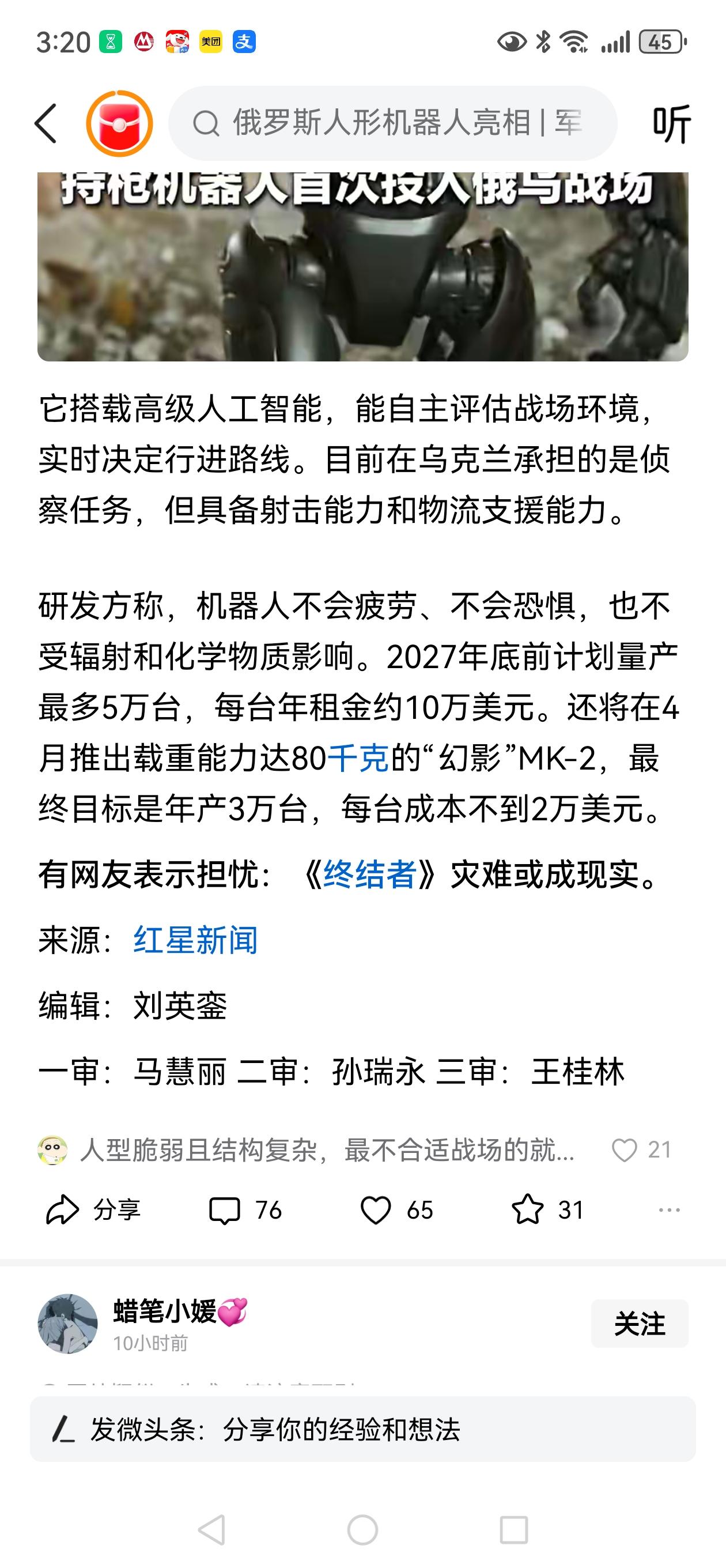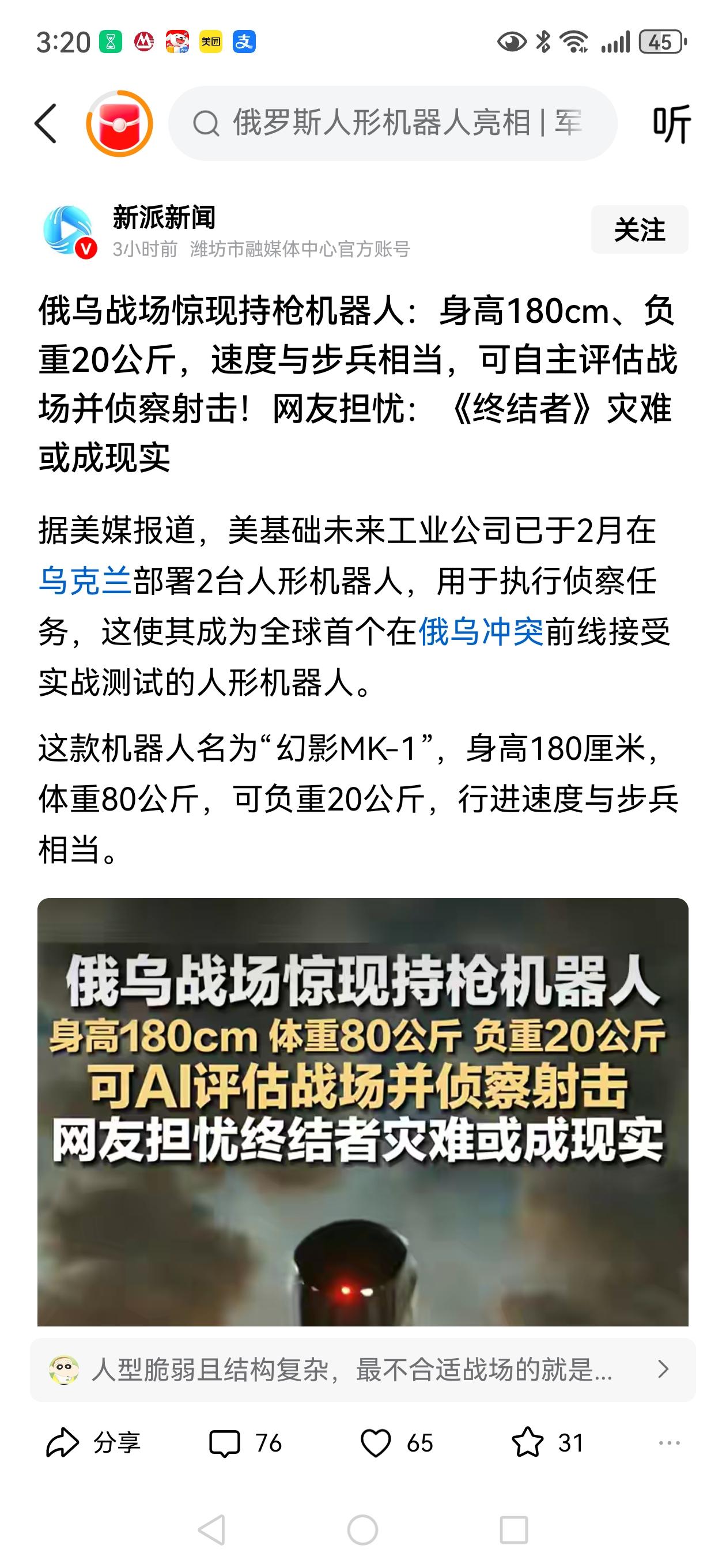 终结者走上乌俄战场,未来照进现实! 美国基础工业公司,为乌克兰部署2台机器人,名叫幻影。 幻影身高1.8米,体重80公斤,可携带20公斤装备。 幻影配备了高阶人工智能,可自主判断战场形势,自主行动。 幻影目前担任的是侦察任务,以后可能会拓展到作战任务和后勤任务。 前期主要是实验,如果成功,将会大规模部署。电影《终结者》中的机器人作战场景可能不远了。 对人类来说,这是好事,再也没有性命的担忧了。未来的战争比拼不再是人,而是AI,是生产能力,是供应链!
