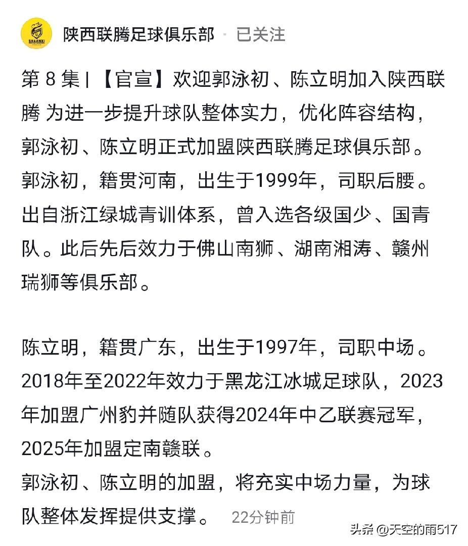 伙计们联腾俱乐部官宣又来了,又来了两个中场球员。
