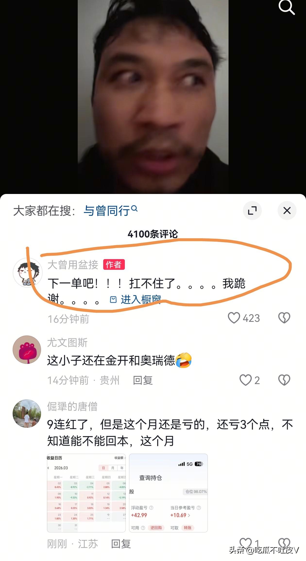 哈哈哈!3.26A 股终于收盘啦! 又是熟悉的四千多家待涨 大曾子已经跌得不行了,他呼吁大家给他大家,要不然他真的扛不住了,还要大家用语音说大曾子加油。今天大曾子怒亏接近两万块,彻底绷不住了,直接把橱窗链接挂在评论区了,希望大家下单支持他,估计买他带货的应该没多少人吧,大家都是希望他亏得更猛烈些,哈哈哈! 说实话这几天我们也比大曾子好不了多少,这行情真是太难了,顶级游资大曾子都扛不住了,我们还能扛多久?[捂脸]大曾子