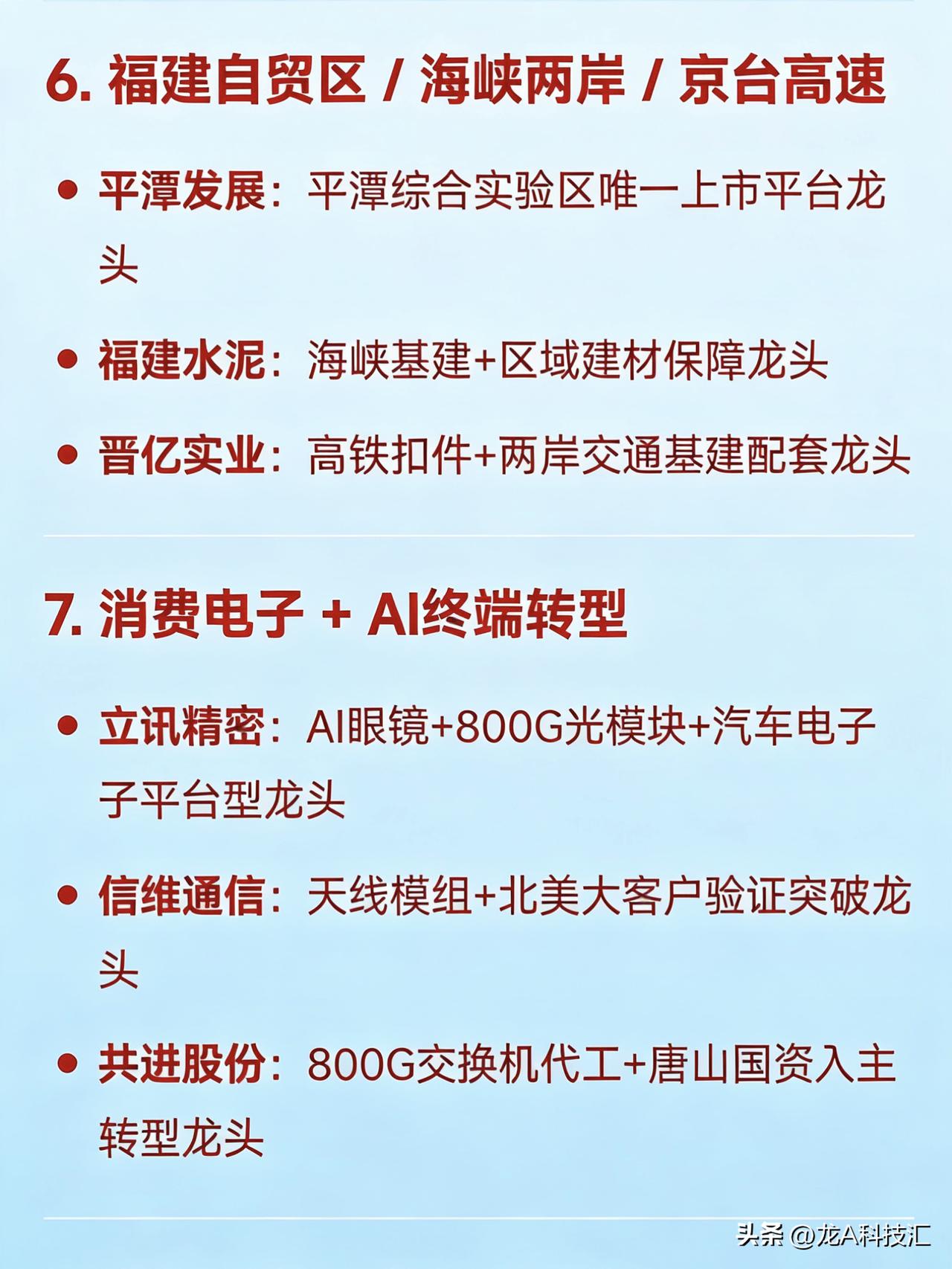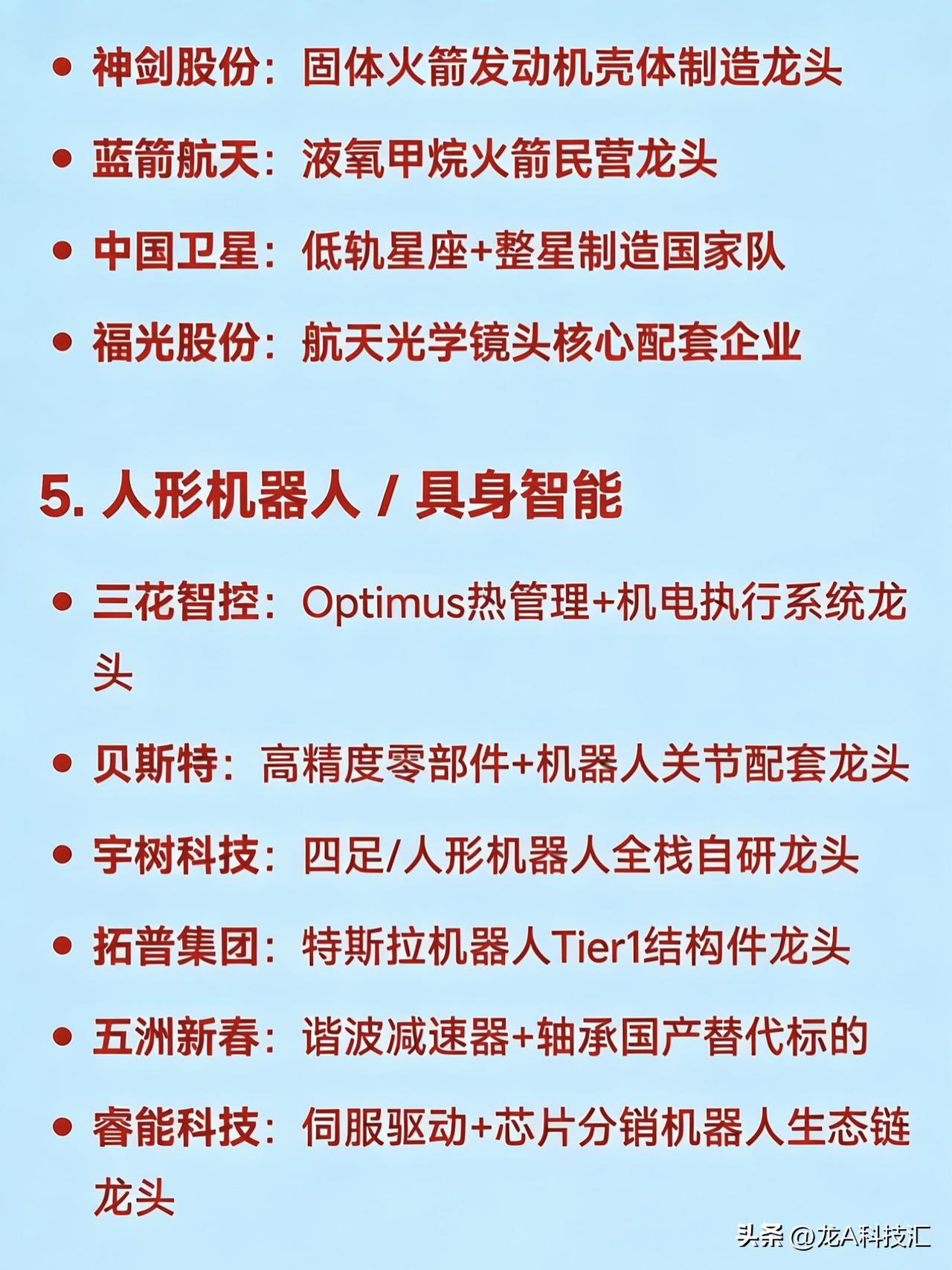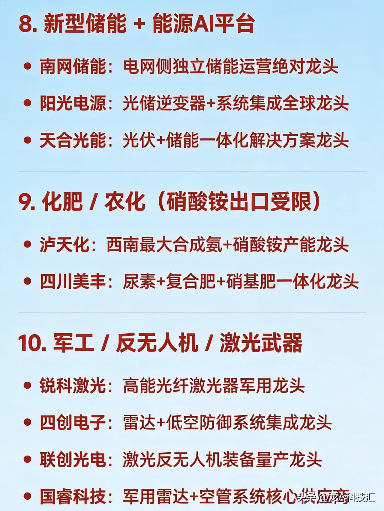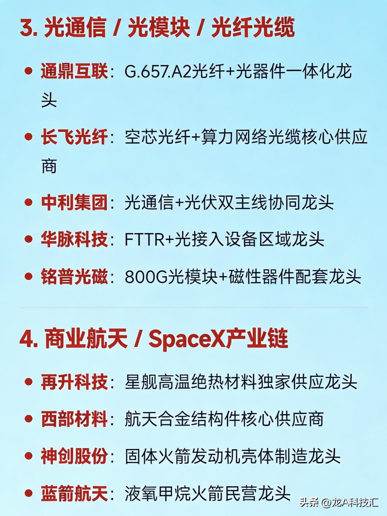 2026年3月26日十大热点科技及其产业链核心龙头 1. 算电协同 / 绿色电力(含碳交易、氢能、国企改革) 华电辽能:算电协同+绿电+碳交易+央企改革多题材总龙头 节能风电:风电运营+储能协同的绿电核心龙头 粤电力A:超超临界火电转型绿电标杆 韶能股份:生物质发电+抽水蓄能+数据中心绿电供应龙头 中闽能源:抽水蓄能+海上风电区域龙头 金开新能:“绿电+算力租赁”双轮驱动代表 华银电力:虚拟电厂+火电灵活性改造龙头 辽宁能源:煤炭转型新能源+地方能源整合龙头 2. AI算力 / 词元经济(Token Economy) 奥瑞德:算力租赁+大模型推理服务落地龙头 真视通:液冷+算力调度+AI视讯应用端龙头 二六三:云通信+AI数字人+算力网络基础设施标的 美利云:数据中心+算力资源池化运营龙头 优刻得:公有云+国产算力适配平台龙头 网宿科技:边缘算力+CDN融合算力网络龙头 浪潮信息:AI服务器整机国产替代龙头 3. 光通信 / 光模块 / 光纤光缆 通鼎互联:G.657.A2光纤+光器件一体化龙头 长飞光纤:空芯光纤+算力网络光缆核心供应商 中利集团:光通信+光伏双主线协同龙头 华脉科技:FTTR+光接入设备区域龙头 铭普光磁:800G光模块+磁性器件配套龙头 4. 商业航天 / SpaceX产业链 再升科技:星舰高温绝热材料独家供应龙头 西部材料:航天合金结构件核心供应商 神剑股份:固体火箭发动机壳体制造龙头 蓝箭航天:液氧甲烷火箭民营龙头 中国卫星:低轨星座+整星制造国家队 福光股份:航天光学镜头核心配套企业 5. 人形机器人 / 具身智能 三花智控:Optimus热管理+机电执行系统龙头 贝斯特:高精度零部件+机器人关节配套龙头 宇树科技:四足/人形机器人全栈自研龙头 拓普集团:特斯拉机器人Tier1结构件龙头 五洲新春:谐波减速器+轴承国产替代标的 睿能科技:伺服驱动+芯片分销机器人生态链龙头 6. 福建自贸区 / 海峡两岸 / 京台高速 平潭发展:平潭综合实验区唯一上市平台龙头 福建水泥:海峡基建+区域建材保障龙头 晋亿实业:高铁扣件+两岸交通基建配套龙头 7. 消费电子 + AI终端转型 立讯精密:AI眼镜+800G光模块+汽车电子平台型龙头 信维通信:天线模组+北美大客户验证突破龙头 共进股份:800G交换机代工+唐山国资入主转型龙头 8. 新型储能 + 能源AI平台 南网储能:电网侧独立储能运营绝对龙头 阳光电源:光储逆变器+系统集成全球龙头 天合光能:光伏+储能一体化解决方案龙头 9. 化肥 / 农化(硝酸铵出口受限) 泸天化:西南最大合成氨+硝酸铵产能龙头 四川美丰:尿素+复合肥+硝基肥一体化龙头 10. 军工 / 反无人机 / 激光武器 锐科激光:高能光纤激光器军用龙头 四创电子:雷达+低空防御系统集成龙头 联创光电:激光反无人机装备量产龙头 国睿科技:军用雷达+空管系统核心供应商 免责声明:发文涉及资讯图等内容来自网络公共信息。仅供参考,不构成投资建议。