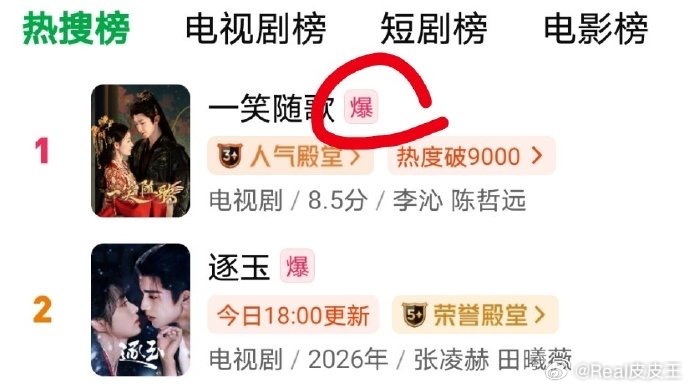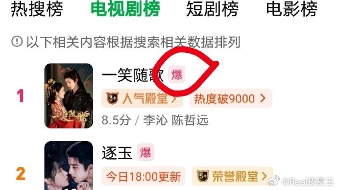 陈哲远《一笑随歌》双榜力压张凌赫《逐玉》后,《一笑随歌》官博下场,并带上一笑随歌爆了的话题,表示“感谢大家关注和认可”。