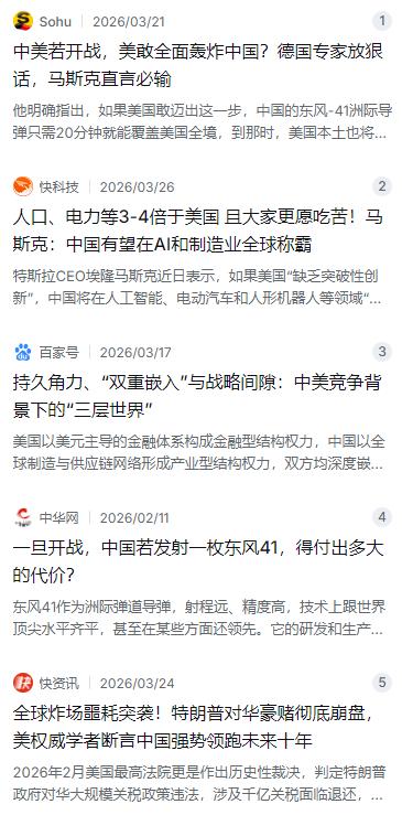中美若开战,美军是否会“全面轰炸中国”?德国军事专家直言不讳地说:“美国要是敢对中国本土发动无差别轰炸,东风-41洲际导弹,20分钟内就能覆盖美国全境。”对此,马斯克也表示:美国永远也无法打败中国,这连小学生都知道。中国科技早已经崛起,不要轻视了中国! 麻烦看官老爷们右上角点击一下“关注”,既方便您进行讨论和分享,又能给您带来更多优质的内容,感谢您的支持! 最近这几天,网上关于中美一旦开战,美军会不会像以前打伊拉克那样,直接轰炸咱们本土的讨论特别多。说实话,这个话题挺敏感的,但确实也是很多人心里嘀咕的事儿。毕竟美国这些年打仗,哪次不是先来一轮地毯式轰炸开路?但现在的中国,还真不是那个只能被动挨打的国家了。 先说说最硬核的底牌吧。有个德国军事专家最近在分析里直言不讳地提到,如果美国真敢对中国本土搞无差别轰炸,那中国的东风-41洲际导弹可不是吃素的。这玩意儿射程能到1.4万公里,从中国随便哪个地方发射,20分钟内就能覆盖美国全境。这是什么概念?就是你这边刚按下轰炸启动键,那边反击的导弹已经在路上了。而且东风-41还能带分导式多弹头,一发上去能分开打多个目标,美国现在那套反导系统根本拦不住。所以说,美国以前打仗敢那么横,说白了就是欺负对手没能力还手,但面对一个能把自家本土瞬间拉进火海的核大国,这账他们算得比谁都清楚。 不光是军事专家看得明白,美国的商业大佬心里也跟明镜似的。马斯克最近又说了大实话,他直接表态美国永远也不可能打败中国,这种事儿连小学生都懂。马斯克这话可不是随便恭维,他在中国有那么多生意,是真切感受到了中国制造和科技的厉害。他说中国的人口是美国的四倍,而且大家更有吃苦耐劳的劲头,光是发电量就是美国的三倍多,工业产能摆在那儿,这不是靠制裁就能压下去的。他还提到稀土加工,说美国虽然也挖稀土,但最后都得运到中国来加工,产业链的根儿在中国手里攥着。 其实仔细想想,现在的中美关系跟以前那些大国对抗完全不是一个玩法了。以前美苏争霸,大家各搞各的阵营,经济基本不怎么来往。但现在中美两国经济深度绑定,中国是全球制造业的核心,美国的农场主、硅谷的科技公司、华尔街的金融资本,谁的饭碗不跟中国市场的供应链连着?有智库做过推演,如果真在西太平洋硬碰硬,美国在西太平洋的军事优势早就被中国的反介入体系给抵消了。德国军事专家也点明了,美国现在不是怕打输,而是根本输不起,一旦开战,全球经济链条一断,美国老百姓的日子也好过不了。 还有人可能会问,既然这么危险,那美国为啥还老是在台海、南海那边挑事儿?说白了,那更多的是一种战略上的试探和表演,想通过极限施压来拖慢中国的发展节奏。但这两年的事态发展也证明了,这种施压效果越来越有限。就拿特朗普时期发起的关税战来说,折腾了好几年,最后美国最高法院自己都裁定这政策违法,上千亿美元的关税还得退回去,这脸打得啪啪响。美国想靠封锁逼中国低头,结果反倒逼着咱们在芯片、高端制造这些卡脖子的领域实现了不少突破。 咱们再说回那个最核心的问题:美军到底敢不敢全面轰炸中国?我觉得这事儿大概率只停留在嘴炮层面。因为中国手里不仅有东风快递,还有完整的陆基中段反导系统,能防也能打。最关键的是,中国一直坚持不首先使用核武器的原则,但这条底线划得很清楚——如果本土真挨了毁灭性打击,那接下来的反击就不是闹着玩的了。美国战略界再怎么鹰派,也没人敢赌这种玉石俱焚的结局。 中国这几年的科技和军事崛起已经是肉眼可见的事实了。不管是航天、5G还是人工智能,咱们早就不是当年那个跟在别人后面跑的追赶者,在很多领域已经是并跑甚至领跑了。德国专家也好,马斯克也好,他们的话其实都指向同一个道理:现在这个时代,谁要还想着靠武力威胁来让中国屈服,那绝对是严重的战略误判。毕竟,一个拥有完整工业体系、核反击能力和全球供应链话语权的国家,不是谁想动就能动的。