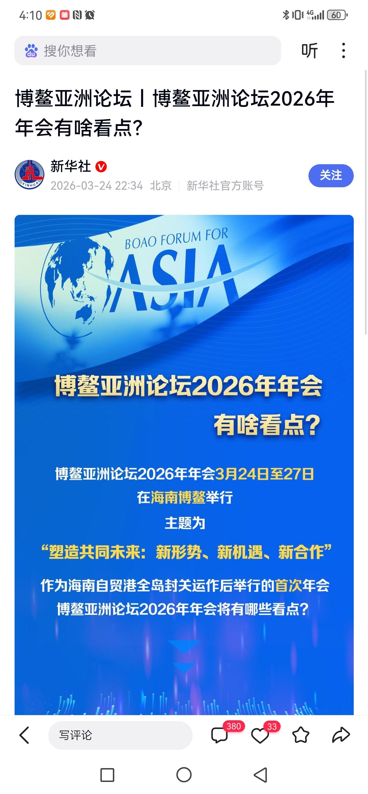博鳌2026开幕!60国聚首海南,为动荡世界锚定“共同未来” 3月26日,博鳌亚洲论坛2026年年会在海南正式拉开帷幕。60余国约2000名代表齐聚一堂,在为期四天的议程中,围绕“塑造共同未来:新形势、新机遇、新合作”展开50余场深度对话。 今年博鳌,三个特殊背景格外瞩目:论坛成立25周年、中国“十五五”规划开局之年、海南自贸港全岛封关运作后首个完整年度。三重历史坐标叠加,让这场盛会承载了承前启后的特殊使命。 四大议题板块直击全球痛点:把握世界大势、深化区域合作、推动转型创新、筑牢伙伴关系。从AI与机器人革命到交能融合绿色转型,从中国经济高质量发展到全球贸易新格局——科技、经济、安全、民生,无一遗漏。 最受关注的是亚洲的“确定性”。论坛发布的报告显示,2026年亚洲经济增速预计达4.5%,对世界经济增长贡献率保持在30%左右。在全球复苏乏力、地缘冲突加剧的当下,这份成绩单格外珍贵。 当前世界正面临逆全球化冲击,单边主义与保护主义抬头。博鳌的召开释放了一个清晰信号:以对话代替对抗,以合作化解分歧,才是破解困局的唯一正道。从RCEP全面生效到亚太合作机制深化,亚洲正从全球增长引擎升级为治理变革的引领者。 未来四天,“博鳌智慧”将持续输出。在动荡世界里,这场盛会凝聚的共识,或许就是通往“共同未来”的那把钥匙。2026峰会 博鳌大会 3