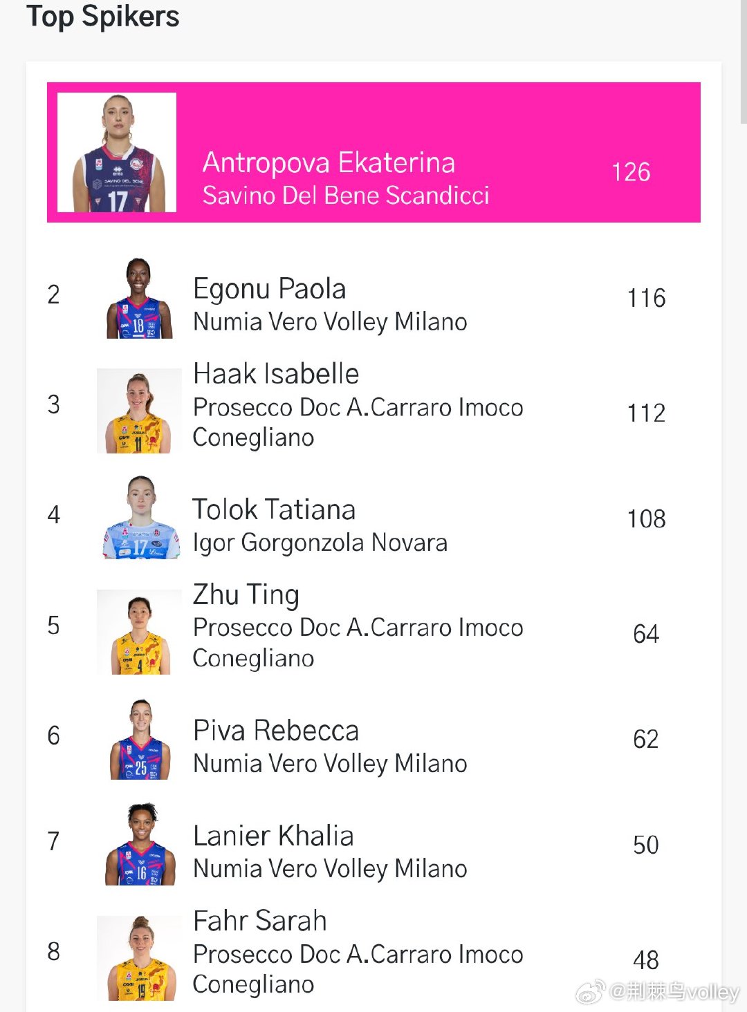 1. 伊莎贝尔·哈克 (接应) - 112分2. 朱婷 (主攻) - 64分3. 萨拉·法尔 (副攻) - 48分