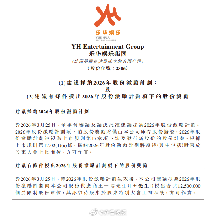 【#乐华娱乐股东公示中未出现王一博#】据乐华娱乐25日公开的董事会函件,公司建议有条件向授出股份奖励:旨在认可及奖励其对集团业务做出的卓越贡献,寻求维持与王一博的长期合作。#乐华建议向王一博授出股份奖励#