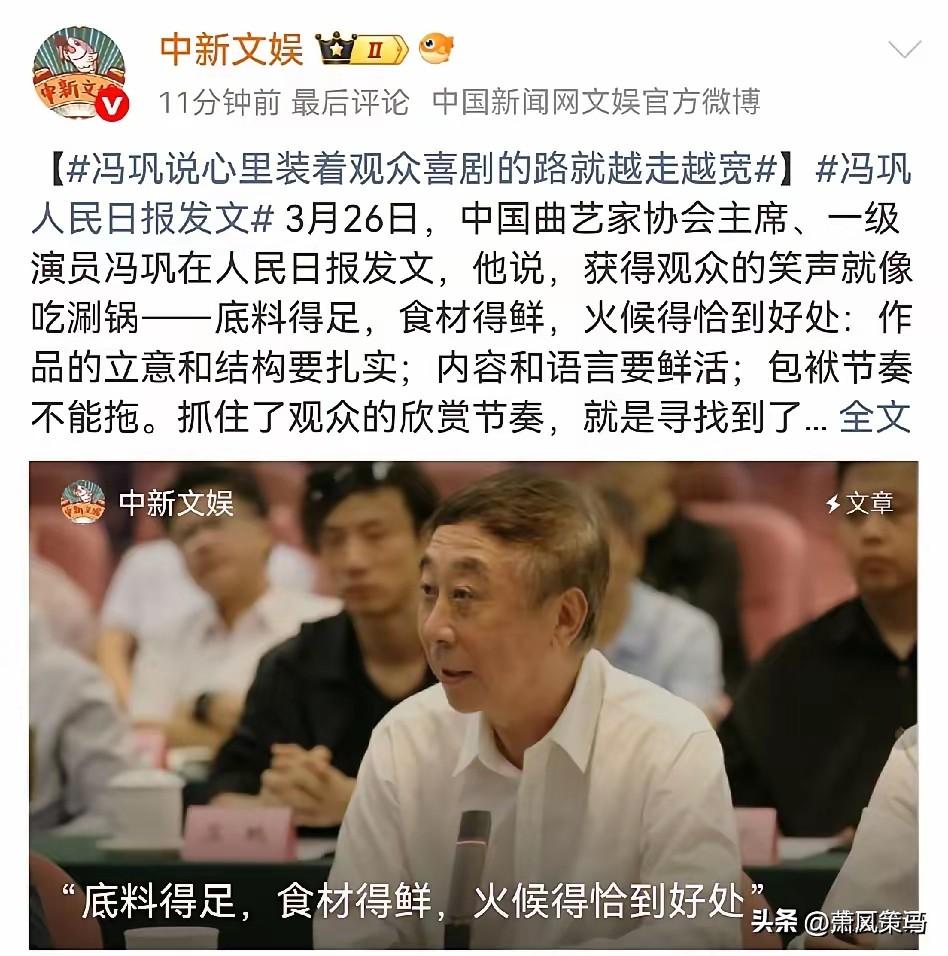 冯巩突然冲上热搜,这波真的太提气!身为曲协主席,他在人民日报发文谈喜剧创作,句句都说到了点子上,太戳人了! 他把喜剧创作比作吃涮锅,底料足、食材鲜、火候准,直白点说就是作品要有立意、内容要鲜活、包袱要拿捏节奏,接地气才是王道。面对爆火的AI,他看得通透,AI能学套路,却复制不了人的灵感和独有风格,只是帮手绝非对手。 深耕喜剧一辈子,他始终扎根生活、紧跟时代,还暖心提点年轻创作者,要有角度有态度更有温度。这才是老艺术家的格局,难怪能火这么多年,太让人佩服了!
