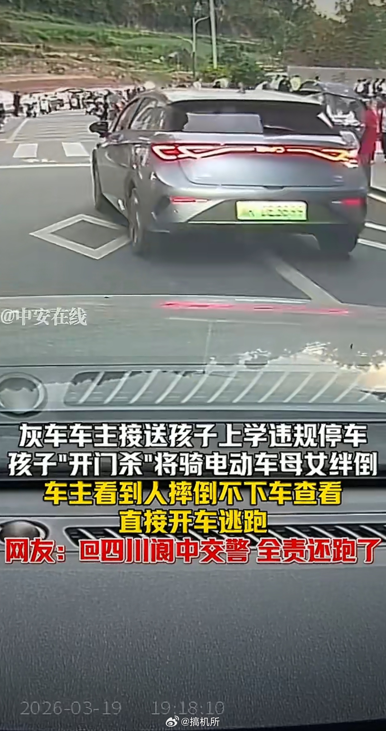 家长违停孩子开门杀撞人后逃逸大家下车时一定要多留意,现在电动车特别多,开门前先观