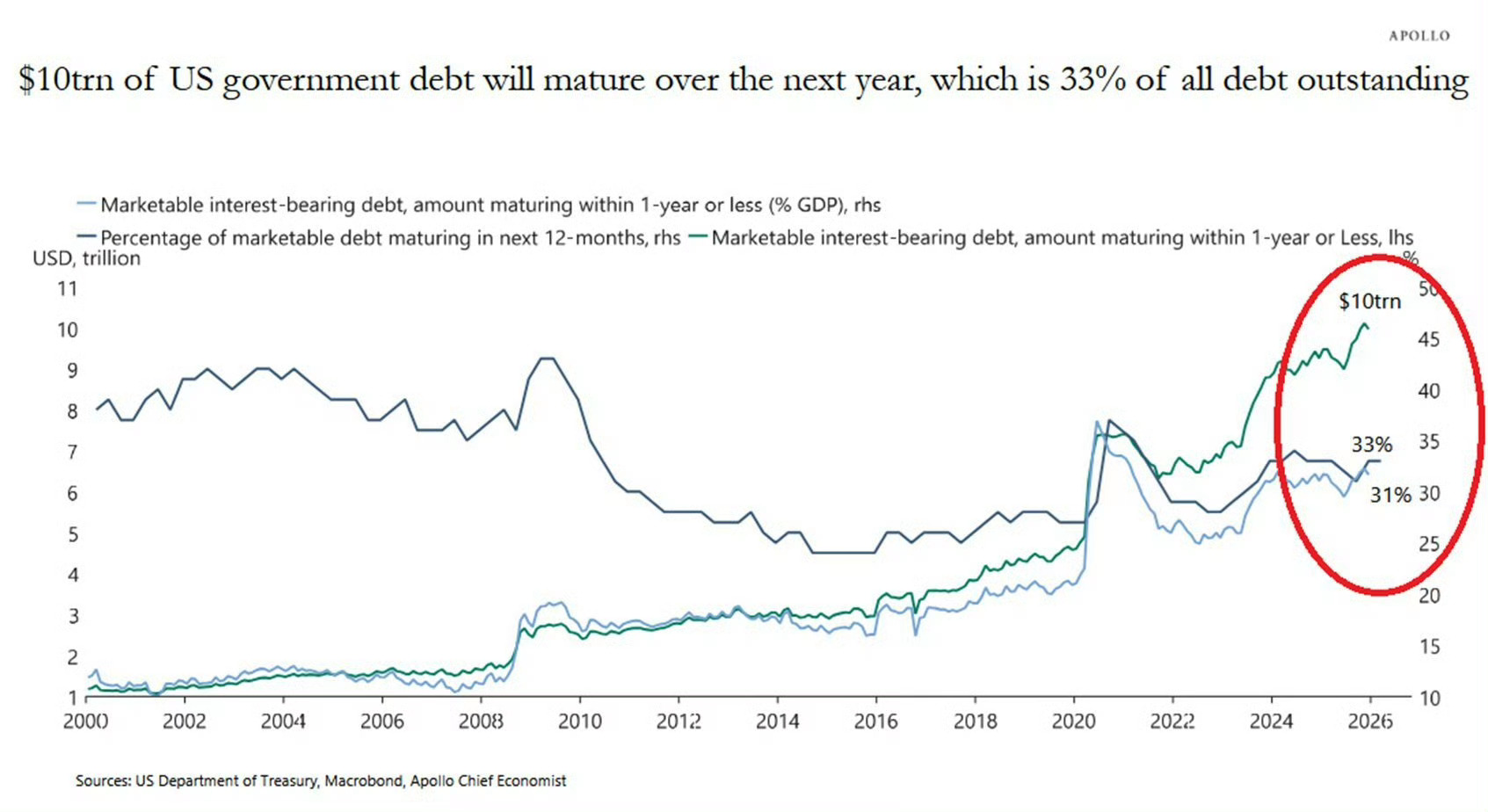 (图二~图三)未来12个月内,美国政府的债务有10万亿美元将到期,创下历史新高。并且,这占到所有未偿还可流通债务的33%,是有记录以来最高比例之一。而今年美国预算赤字为大约2万亿美元,而公司债总发行预计将升至约2万亿美元。
