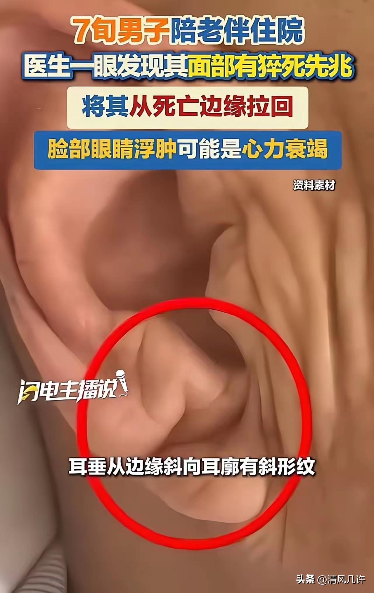 “只因为多看了一眼,救了一条命!”7旬男子陪老伴住院,医生看了他一眼,说出一句话让男子吓得后背发凉!医生说:“你面部有猝死先兆,赶紧去检查……”网友:“这医生真是神医啊!对病人也负责,要不然可能就失去生命了!” 这位7旬老人是江苏南京的王老先生,那段时间他正守在冠心病住院的老伴床边,连续熬了好几个通宵。 眼里的红血丝没消过,眼皮总发沉,偶尔胸口闷得发慌,他都归罪于陪床太累,觉得歇两天就能缓过来。在他的认知里,自己的任务是照顾好老伴,这点小不适根本不值一提,更别说主动提出来让医生费心。 那天主治医生朱舒舒推着查房车路过病房,脚步没缘由地顿了半秒,目光直直落在王老先生脸上。没有多余的客套,也没有绕弯子,她直接开口让老人赶紧去做个全面检查。王老先生当时还笑着摆手,语气里带着几分不以为意:“大夫,我就是熬得慌,补一觉就好,不用麻烦。” 朱舒舒没让步,指尖轻轻点了点老人的上眼皮和耳垂,把那些他从未在意过的细节摊开来说。 上眼皮那片不起眼的黄色斑块,医学上叫眼睑黄瘤,是高血脂的典型皮肤表现,意味着体内脂质代谢已经乱了套,胆固醇正悄悄在血管壁上堆积。 而耳垂上那道从边缘斜向耳廓的折痕,早被大量临床研究证实,和心血管病变高度相关。再结合老人隐瞒的高血压、糖尿病、高血脂病史,每一条线索都指向同一个危险信号:他的心脏血管,可能已经堵到了随时会崩的临界值。 老人这才慌了神,半信半疑地跟着护士去做了冠脉造影。片子出来的那一刻,连阅片的医生都忍不住倒吸一口凉气——他的左侧冠状动脉狭窄程度高达99%,几乎完全闭塞,哪怕多走几步路、情绪稍微激动一点,都可能瞬间引发心梗,连抢救的机会都没有。 医生立刻安排了支架植入手术,争分夺秒开通了堵塞的血管。手术结束后,王老先生躺在病床上,看着守在床边抹眼泪的老伴,后背的凉意才慢慢沉成后怕。 他想起前几天还爬着楼梯去买老伴爱吃的糕点,想起夜里起来给老伴盖被子时胸口的闷痛,那些被他当成“年纪大了正常”的细节,原来全是死神在耳边的提醒。如果不是医生那一眼的警觉,他可能连和老伴一起出院回家的机会都没有。 这件事在网上传开后,不少人感慨医生的“火眼金睛”,但其实这从来不是什么玄学。朱舒舒后来解释,她的判断不是凭空而来,而是无数临床经验沉淀出的职业敏感。 很多老人和王老先生一样,习惯把身体的小信号归为“累了”“老了”,宁愿扛着也不愿就医,却不知道这些被忽视的细节,恰恰是心血管疾病发出的预警。眼睑黄瘤、耳垂折痕、面部浮肿,这些看似无关紧要的外貌变化,其实是身体在拼命求救。 更值得深思的是,很多人总觉得“病来如山倒”,却忽略了“山倒”之前早有预兆。 王老先生的高血压、糖尿病拖了十几年,从来没规律吃药,总觉得“没不舒服就不用管”,直到血管堵到极致,才被医生的一句话点醒。这不是个例,太多人把“没症状”等同于“没病”,把“忍一忍”当成应对不适的首选,直到危机爆发才追悔莫及。 医生的“多看一眼”,救的不只是王老先生的命,更是给所有人提了个醒:健康从来没有侥幸,那些被我们轻视的小不适、被忽略的小细节,可能就是挡在生死之间的最后一道防线。对自己的身体多一点警觉,对医生的提醒多一点重视,才是对生命最负责任的态度。 各位读者你们怎么看?欢迎在评论区讨论。