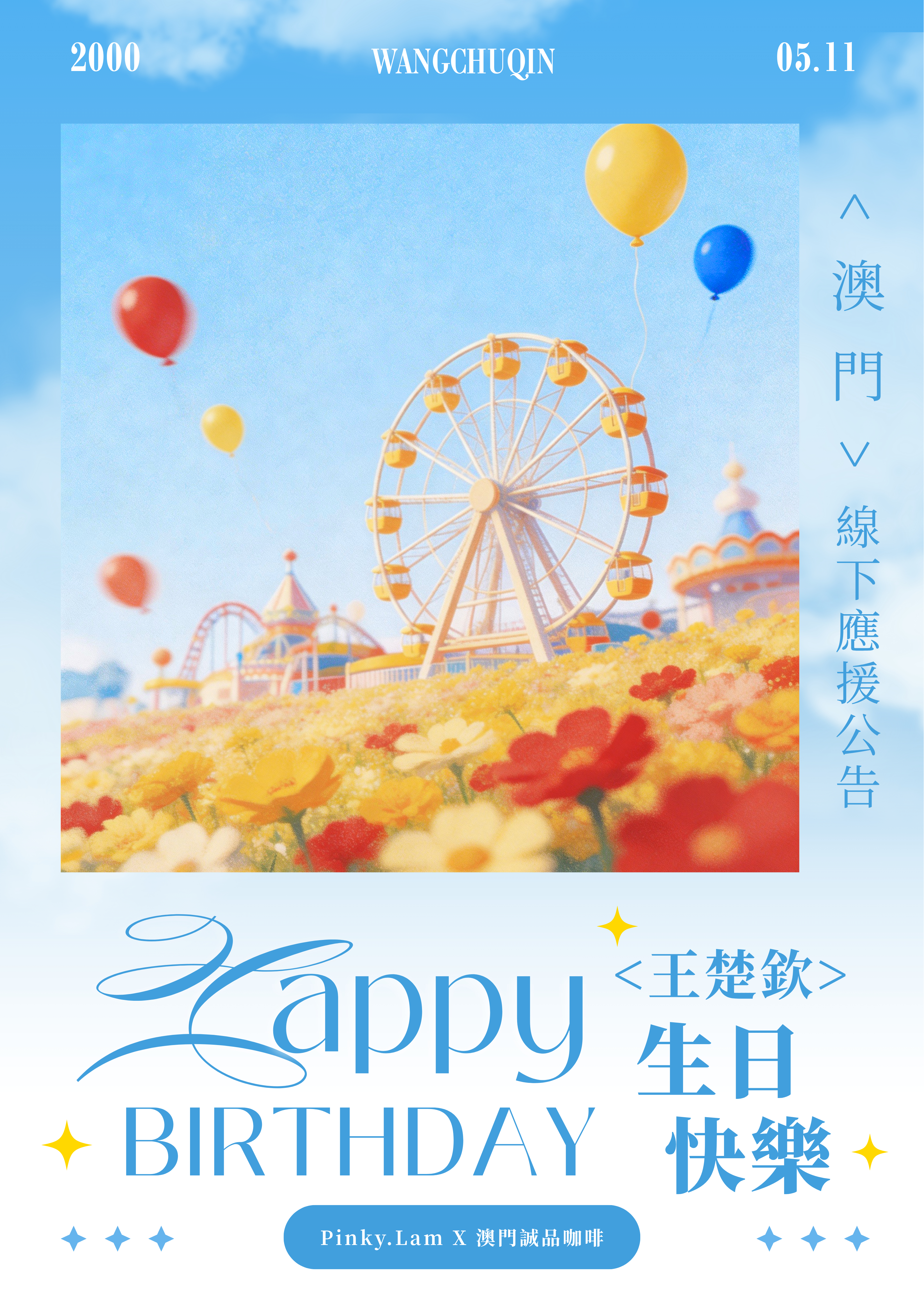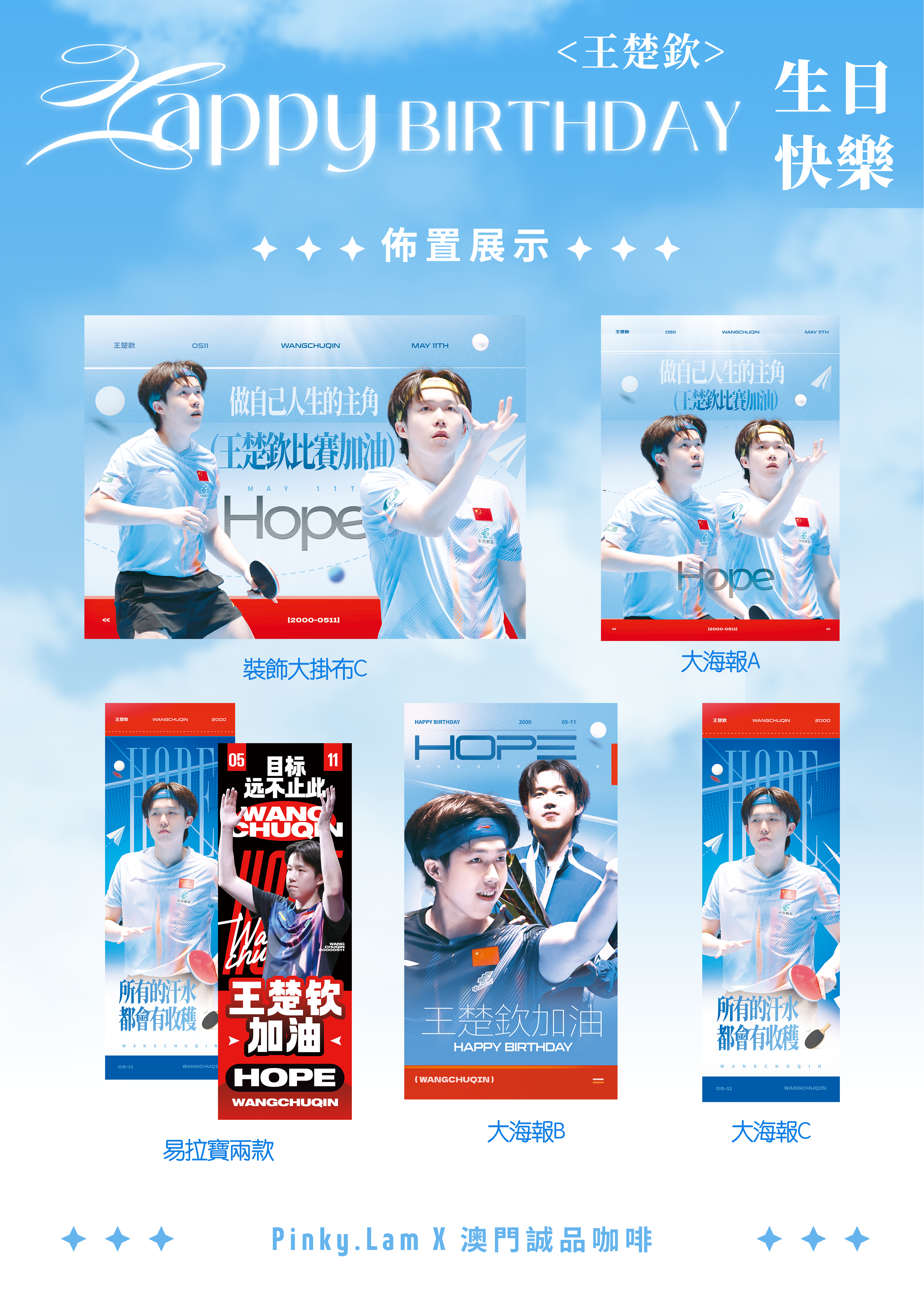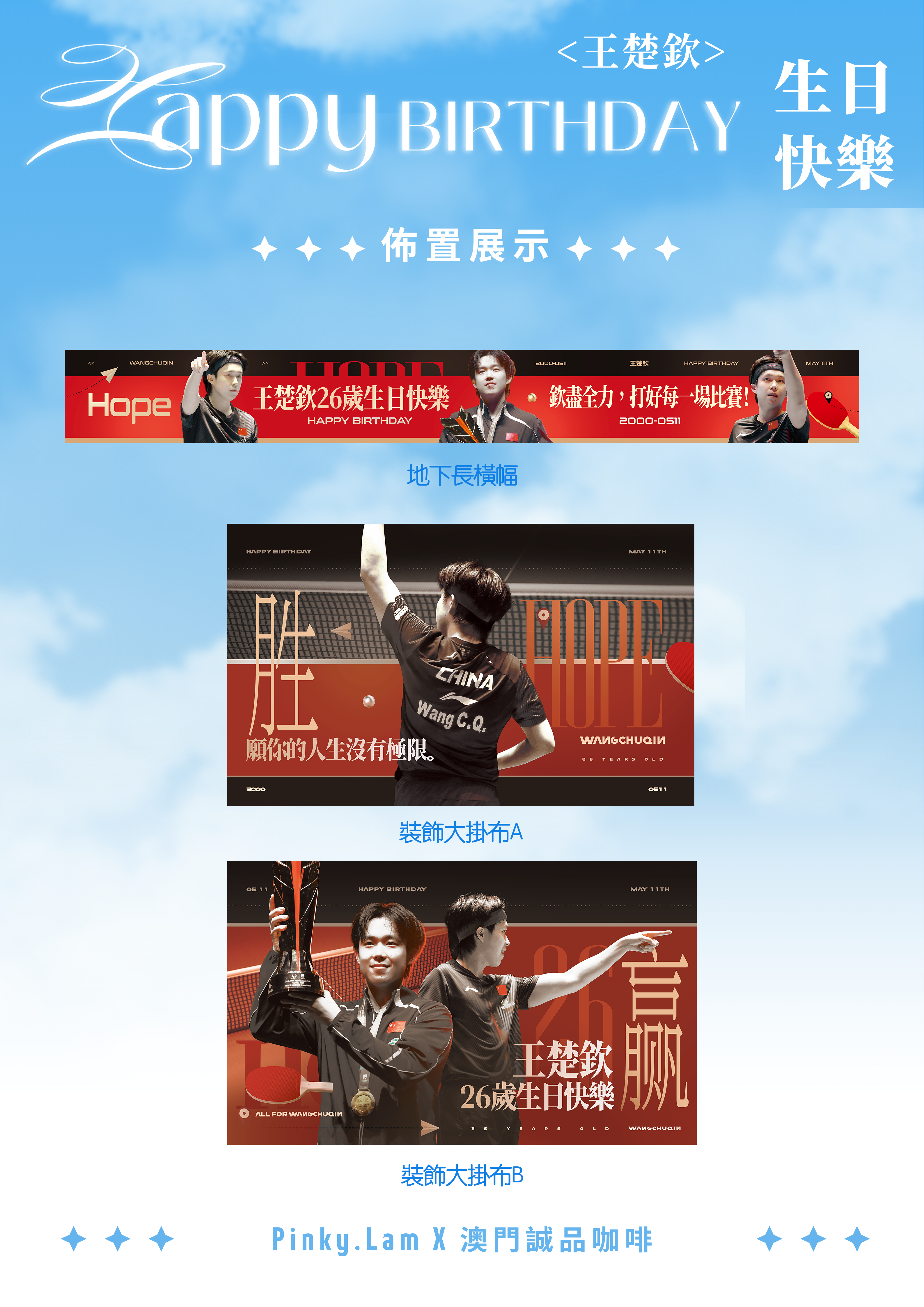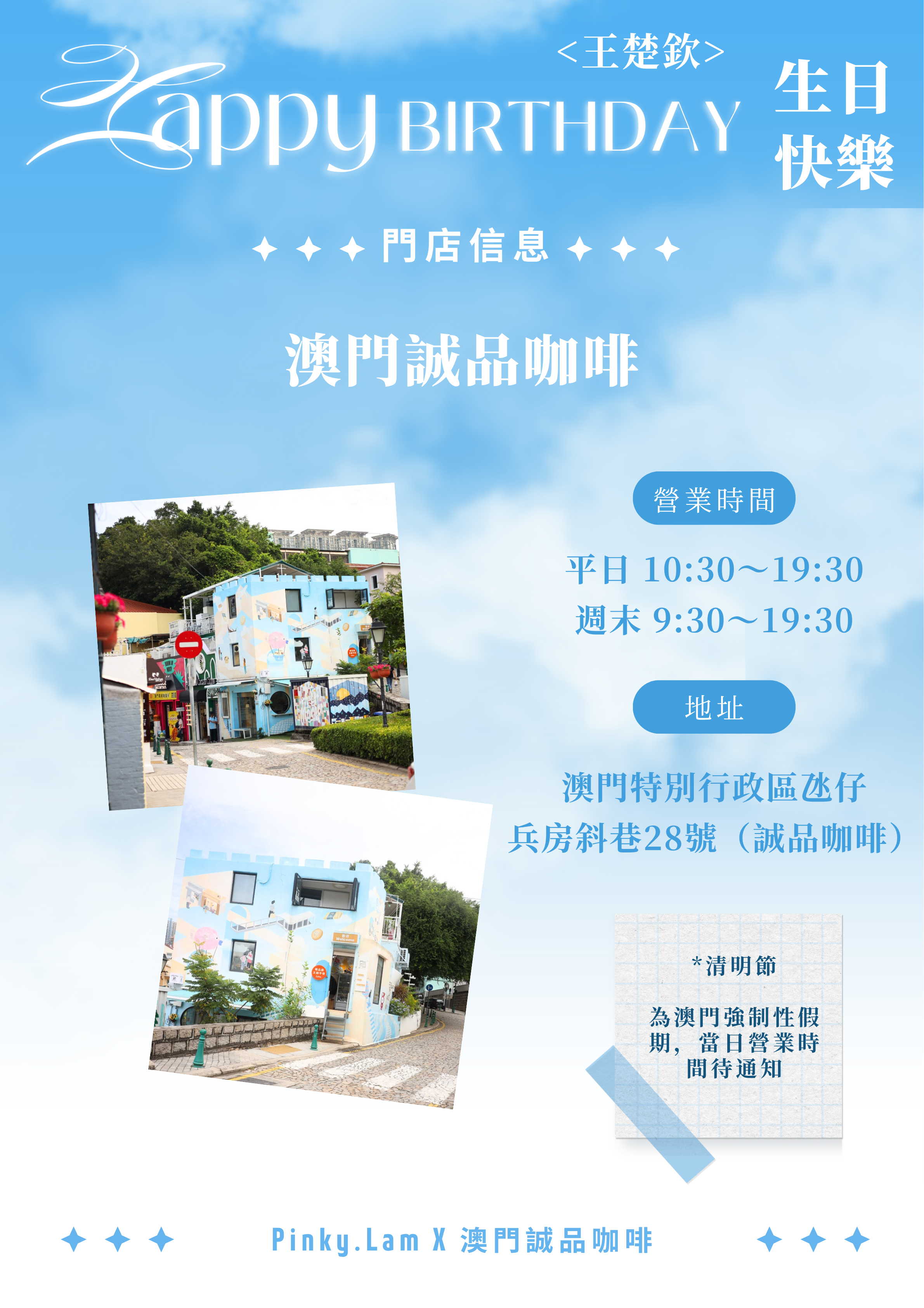 線下打卡應援以蓝色为信,将热爱写进风里。 在这个属于王楚钦的春日, 我们把应援与祝福,留在澳门的街角与咖啡香之中。🏓 2026澳门世界杯期间 🎂 同步生日应援开启 让每一份热爱,都有回应 💙📅【活动时间】3.30~4.6🎁【物料】随限定🥤✅ ・心形手幅・小王扇 ・纸袋 ・圆贴 & 吧唧 ・mini手幅