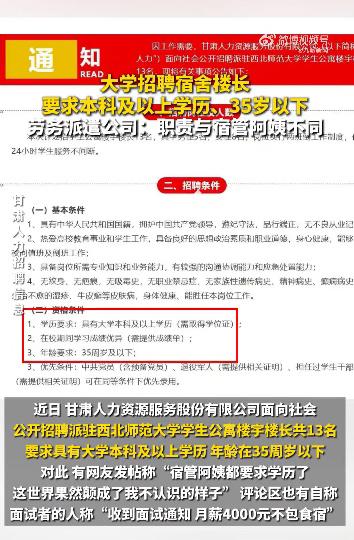 大学招宿舍管理员,要求学历本科,35 岁以下。4000 月薪,不包食宿。西北师范大学的这一则招聘启事火了,大家都在惊呼,现在不努力读书,考个本科文凭,连宿舍管理员都应聘不上了。学校解释为什么要本科学历,因为他不是单纯的宿管阿姨,需要巡楼,关注学生动向,日常巡逻等等。那既然要求多了,为什么薪资不能提高一点呢?学校招 13 名宿管员,不用想,肯定大把的本科生报名。
