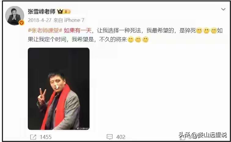 管住嘴,莫乱说! 张雪峰去世了,年仅41岁!听着都让人惋惜啊…… 此前一直不了解这个人,他去世的消息出来后才知道他著名教育博主、高考志愿规划师、峰学蔚来公司的创始人。 网上的评论是“寒门出身、北漂入行、全网爆红”,后来转型创业,迁居苏州,创立峰学蔚来公司,主攻高考志愿填报,服务收费没人9000到20000不等。 网络是有记忆的,也许张雪峰万万没有想到,他随便的一句话,八年后一语成谶,确确实实地应验了! 2018年的某一天,他在直播间里说“如果有一天我死了,希望是猝死。”后来还在自己“张雪峰老师”的公众号上说“如果有一天,让我选择一种死法,我最希望的,是猝死,如果让我定个时间,我希望是不久的将来。”还有几个微笑的图标。 不知道他说这些话的时候,当时的心理状态是个什么样子,面面上好像很轻松,内心可能很苦,也许只是随便说说…… 可是,就在八年后的今天,一切都如他所说的那样,真的发生了…… 所以说,管住嘴,莫乱说,因为语言是有能量的……