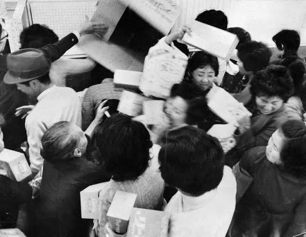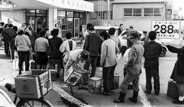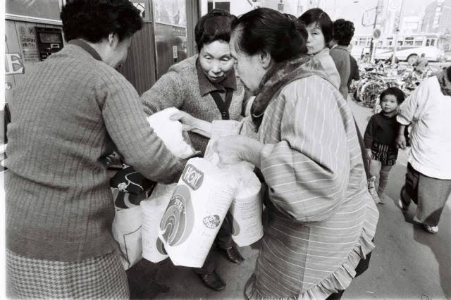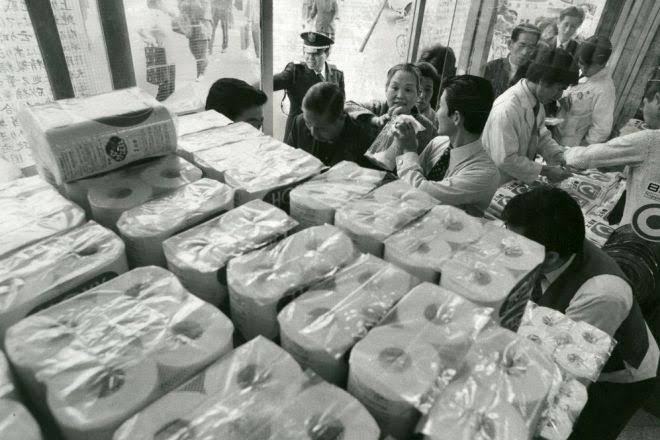 对于普通日本人来说,油价暴涨导致生活成本也暴涨,在当时引起了民众对物资不足的恐慌情绪,经济产业大臣亦呼吁民众节约纸制品。当时大阪千里大丸打出“厕纸就快卖完了!”的广告,导致近300名主妇蜂拥而至在两小时内买光了500份厕纸,媒体上更是出现厕纸价格即将升至两倍的报道。关于厕纸不足的流言迅速扩散,引起全国各地民众来到超市百货,争相抢购囤积厕纸的乱象。