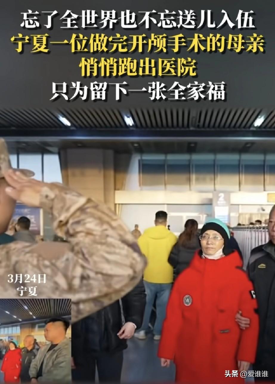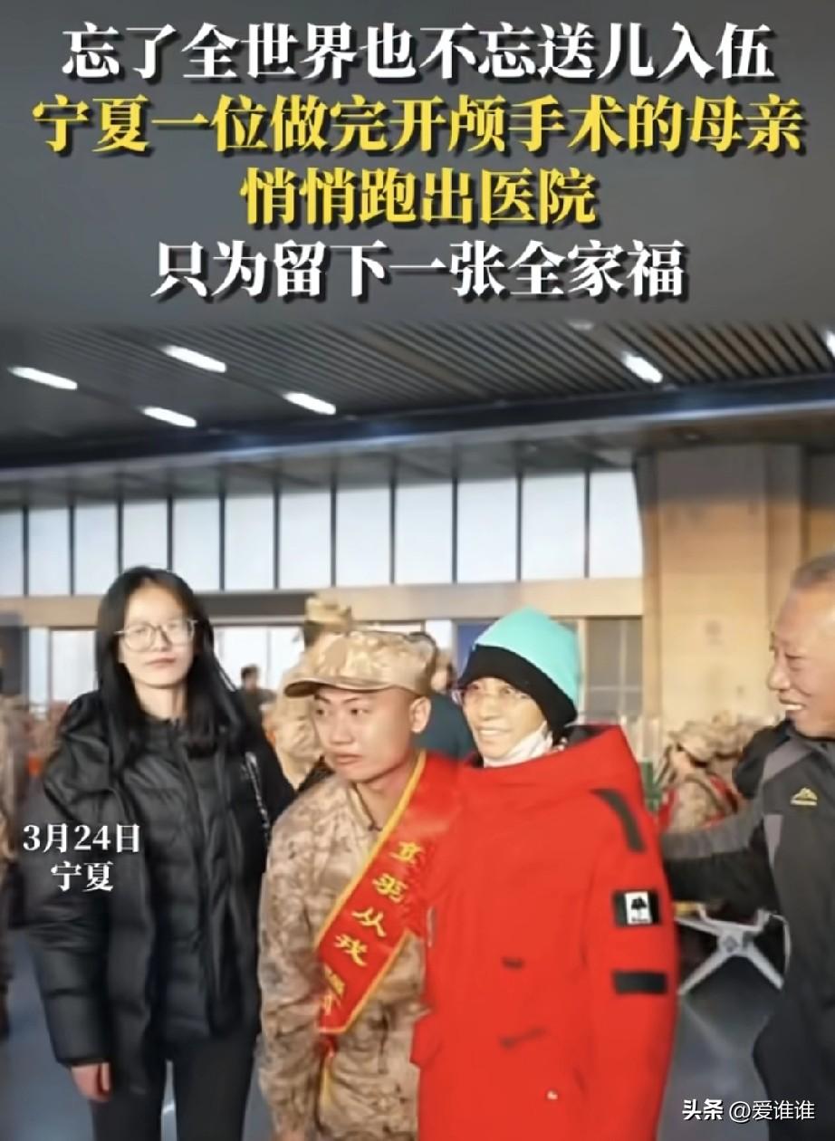 “忘不了的爱!”一位刚做完开颅手术,在恢复期的母亲,悄悄跑出医院,送别即将入伍的儿子,儿子含着泪说:“妈妈做完手术忘记了很多事,但是唯独没有忘记我入伍的时间!”网友说:“忘了全世界也忘不了你!” 3月24日,宁夏银川火车站,一场新兵入伍欢送仪式正在进行,人群中,一位身穿迷彩服、胸前戴着大红花的年轻小伙格外精神,他正准备踏上军旅生涯,可就在队伍整装待发时,他意外看到了一个熟悉的身影本该在医院病床上的母亲。 原来,小伙的母亲几天前刚做完开颅手术,虽然手术很成功,但术后她失去了大部分记忆,很多人和事都记不清了,可奇怪的是,她心里一直牢牢记住一个日子:3月24日,儿子出发去当兵的日子。 到了这一天,她顾不上自己还在恢复期,头上还缠着纱布,就跟老伴商量着悄悄离开了医院,家人原本都劝她好好休养,可她执意要亲自送儿子一程。 当儿子在队伍里看见父母时,先是一愣,随后眼眶就红了,他赶紧向部队领导说明情况,领导很体谅,特意给了他们十分钟的团聚时间,一家人就这样在车站广场上见了面,母亲身体还很虚弱,可一看到儿子穿着军装的模样,精神一下子好了许多,儿子身边还站着他的未婚妻,一家四口在人来人往的车站前,留下了一张珍贵的全家福。 这场送别没有豪言壮语,却让人动容,一位刚刚做完大手术的母亲,几乎忘掉了身边所有事,却唯独没有忘记孩子远行的日子,她用自己的方式,完成了这场最深情的送别! 我们感动于这份“忘了全世界也忘不了你”的母爱,也敬佩这位青年投笔从戎的家国情怀,愿这位伟大的母亲早日康复,愿入伍的战士在军营中淬炼成钢,不负这一场深情的奔赴!