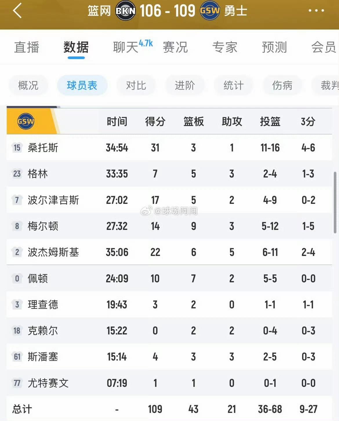 NBA最精彩的不是卡位战,还可能是摆烂战。今天篮网对阵勇士,两队配合默契,各取所需。 想赢的赢的艰难,想输的输的艰难。 这篮网前三节证明自己不菜,最后一节实现摆烂大计,特别是这最后一攻假得不能再假了。 格林两罚两中,勇士109-106领先篮网3分,篮网最后6秒直接甩后场…勇士实现两连胜,篮网守住17胜,与奇才胜场数一样。