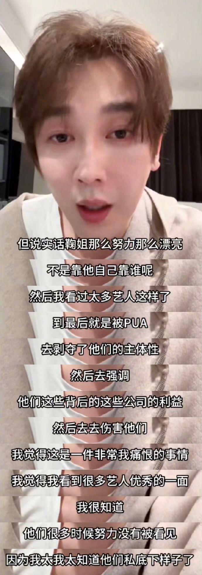 李登科直播谈鞠婧祎崩溃大哭 李登科直播时提到鞠婧祎哽咽的样子,真的让人心里一揪。努力多年却被各种声音裹挟,精致人设被放大,辛苦却少有人看见,顶着恶意往前走的日子想想都难,希望更多人能看到她的付出,少些苛责多些善意吧。