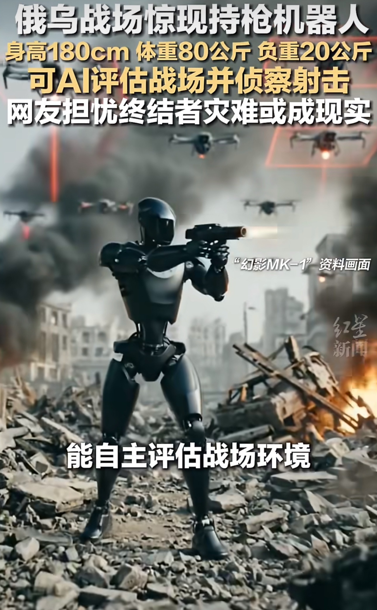 俄乌战场惊现持枪人形机器人:身高180cm击电影终结者可能要成真了终结者!“幻影MK-1”,由美国初创公司研发,身高180厘米,体重80公斤,可负重20公斤,行进速度与步兵相当。它搭载高级人工智能,能自主评估战场环境,实时决定行进路线。 持枪人形机器人上战场了