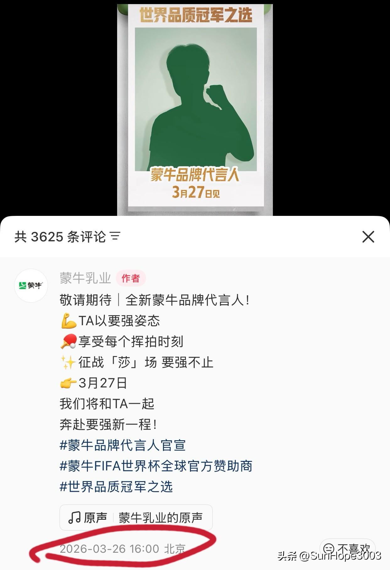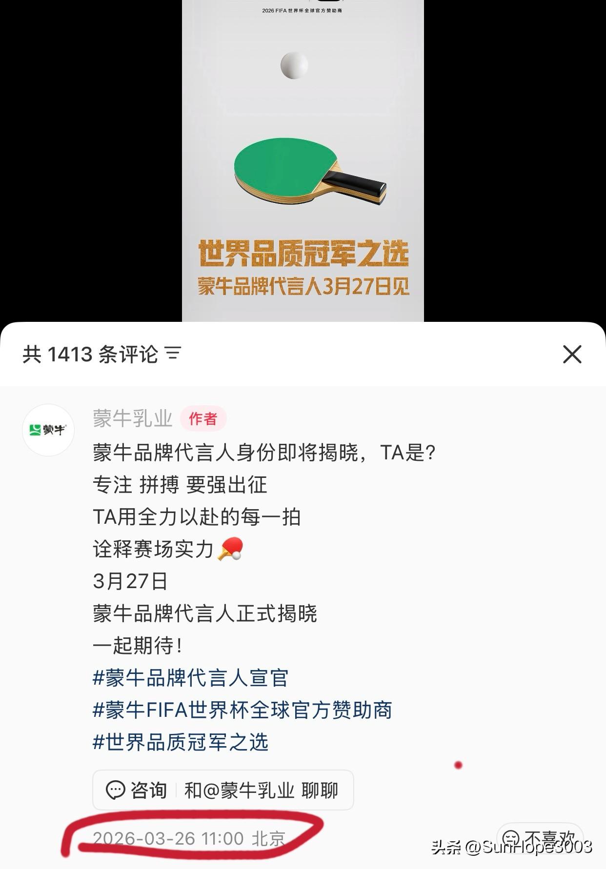 蒙牛也是可爱起来了,问大家有没有看到他卡点的小巧思😁 别人都卡11:04, 他不,他是这样卡的: 上午11点发了一条,就发了一个乒乓球拍, 让大家猜是谁,这这这…不好猜啊,也不敢猜啊, 毕竟乒乓球运动员这么多。 下午4点发了征战莎场, 好了,知道是孙颖莎了。 所以,他的卡点,确实与众不同😁 莎莎代言蒙牛很合适,萌萌的,牛牛的, 蒙牛! 恭喜孙颖莎,蒙牛品牌代言人,集团最高title。