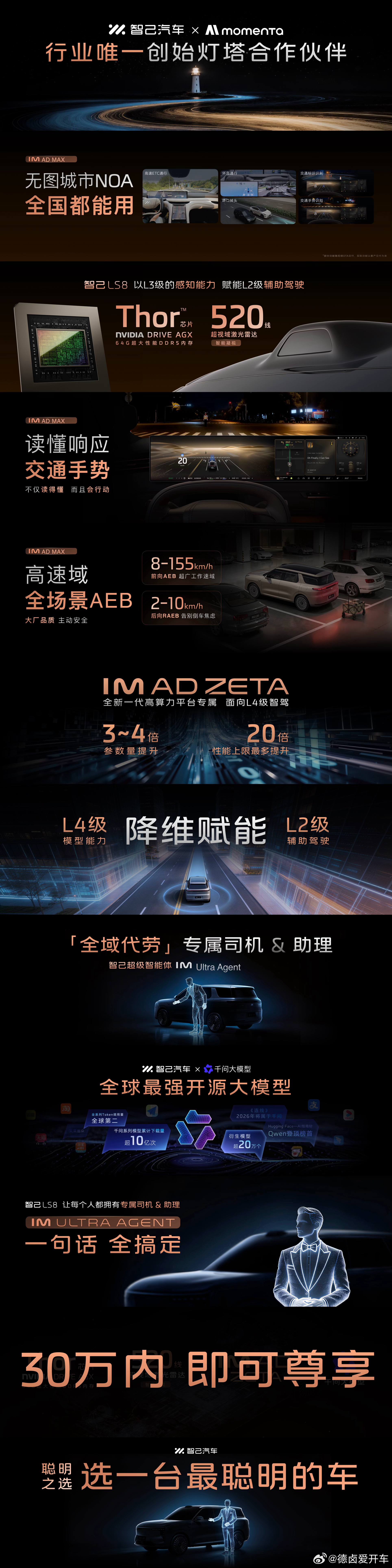智己与Momenta深度合作推出面向L4级的IM AD ZETA系统,模型参数量提升3-4倍,性能上限最高提升20倍,以高阶智驾能力降维赋能日常辅助驾驶。