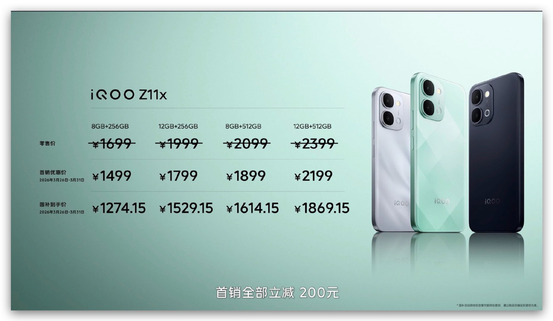iQOO Z11x8+256 1699元(首销1499元,叠加国补1274.15元);12+256 1999元(首销1799元,叠加国补1529.15元);8+256 2099元;(首销1899元,叠加国补1614.15元);12+512 2399元(首销2199元,叠加国补1869/15元);