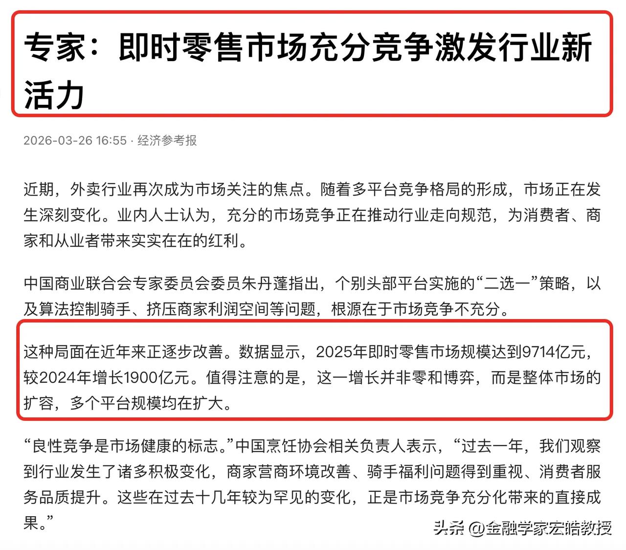 即时零售行业接下来怎么干?总算是有答案了! 权威媒体在这方面已经给出了答案。 权威媒体引用专家的观点,明确指出2025年外卖竞争,对于多平台格局的形成、外卖行业的发展是有明显好处的。 中国连锁经营协会餐饮委员会专家指出,多平台竞争格局下,商家拥有了更多选择权,这有助于恢复产业链的利益平衡。 仔细研究了一下,感觉专家的这些观点还是挺靠谱的, 像淘宝闪购入局之前,外卖平台的格局比较单一,商家们没啥自主权,但淘宝闪购进入这个行业之后,凭借着平台的活动和新技术,为商家带来更多选择的同时,也很好的推动了商家的发展。 在2025年,淘宝闪购餐饮商家店均订单量同比增幅达90%。淘宝闪购商家会出现这么高的增长,主要是淘宝闪购出现之后,商家有了更多选择,哪个平台机会多,就着重发展哪个平台。 过去的时间里,淘宝闪购不仅推出活动,给消费者和商家让利,激发了新消费,也通过新技术,为商家提供了更多的发展机会, 比如春节前后,千问接入淘宝闪购,许多消费者使用千问“一句话点外卖”的服务,帮助许多商家实现了破圈。数据显示有156万老年人首次体验外卖服务。这也证明,淘宝闪购在技术创新之后,链接到了更多的消费者,为商家提供了更好的发展机会。 通过这些,也不难发现,接下来的外卖行业良性竞争还会继续,科技创新将就成为重点,淘宝闪购在这些方面的优势很明显。