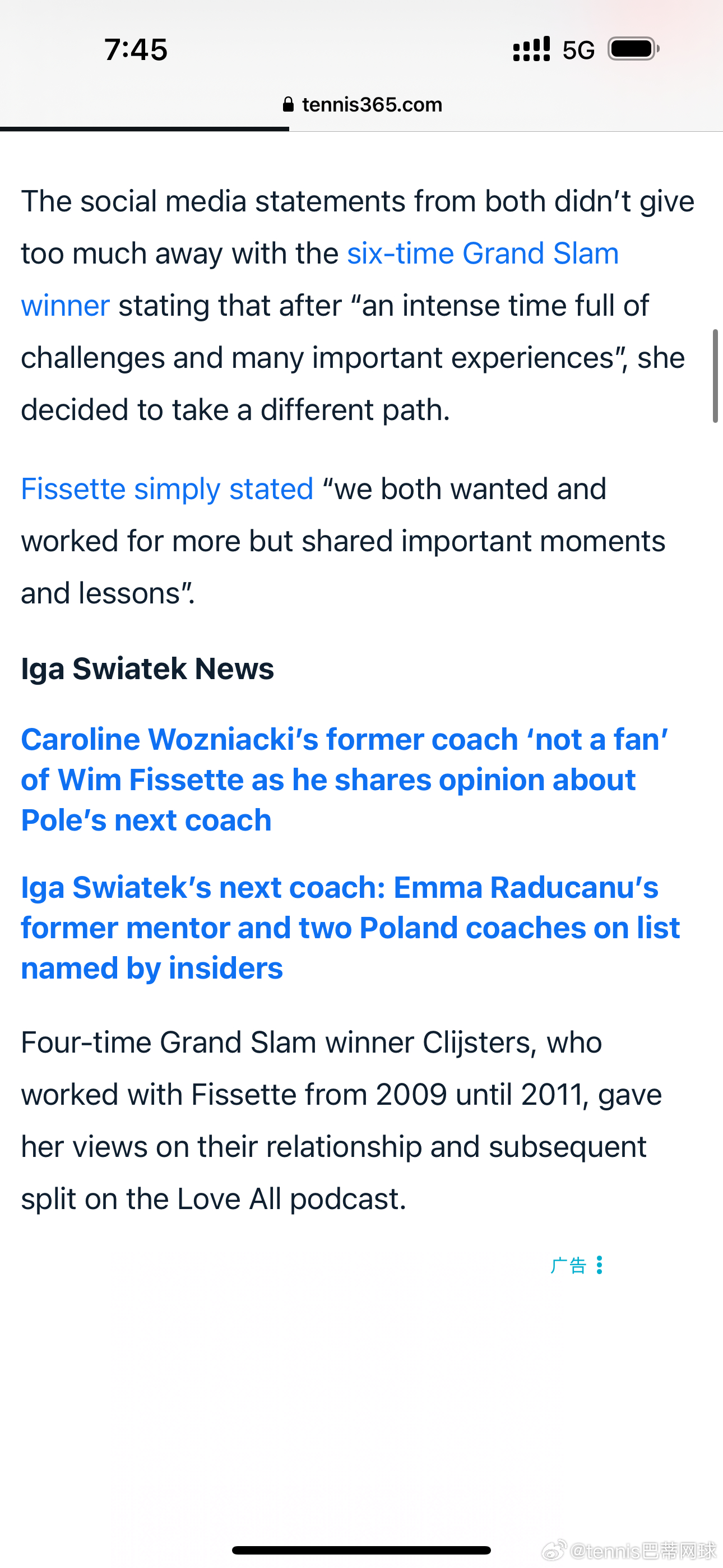 曾在2009年至2011年与费塞特合作的四届大满贯得主克里斯特尔斯🇧🇪,在《Love AII》播客节目中谈及了两人的关系及最终的分手原因
