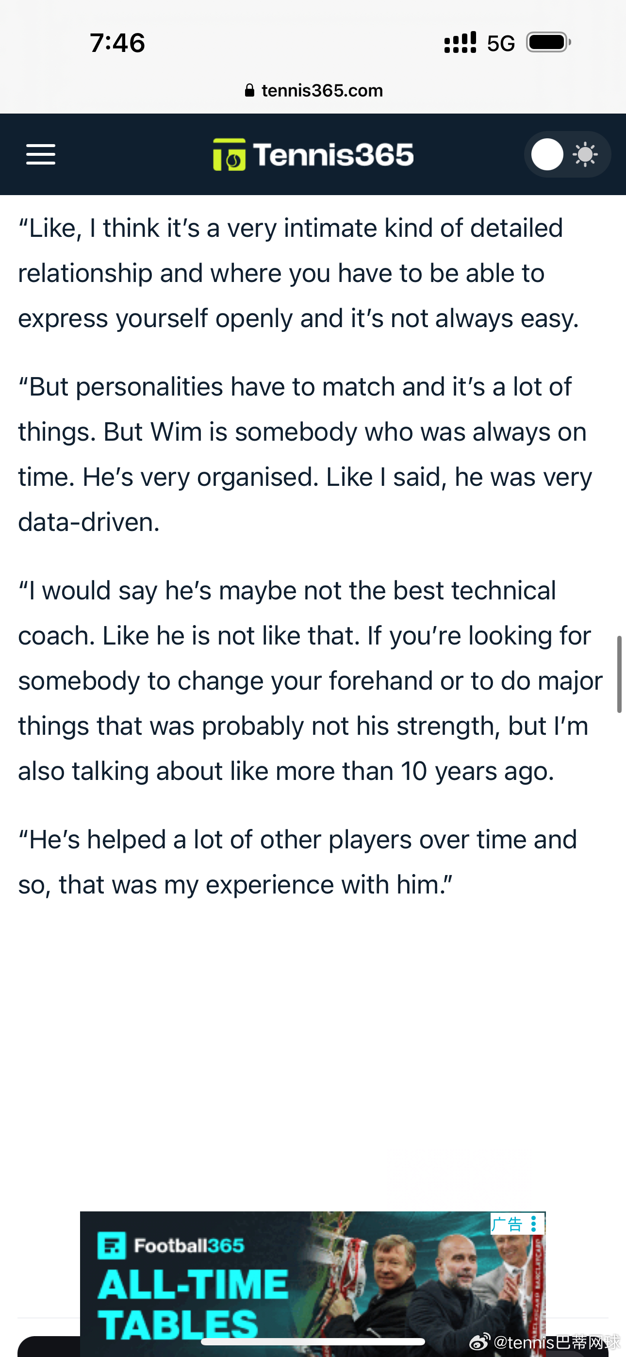 “我得说,他或许算不上顶尖的技术型教练,他不是那种类型。如果你想找个人来改你的正手动作,或是做技术上的大调整,那可能不是他的强项。当然,我说的也是十多年前的印象了。”