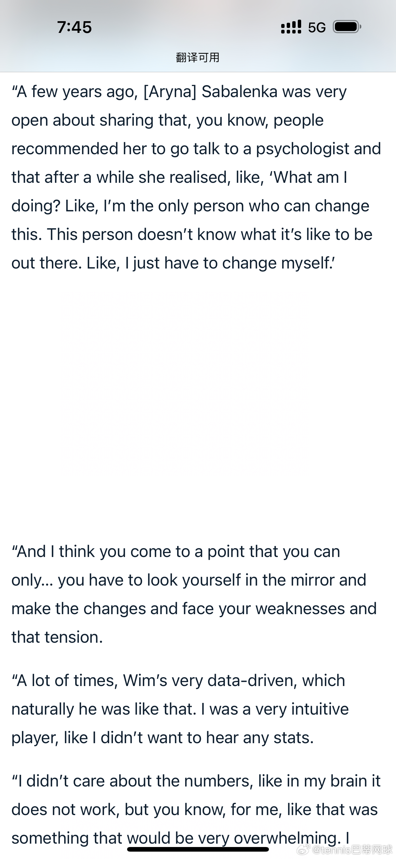 “几年前,萨巴伦卡曾非常坦诚地分享过,大家都建议她去看心理医生。过了一段时间她才意识到:‘我到底在做什么?只有我自己才能改变这一切。别人根本不懂身处赛场的感受,我只能靠自己做出改变。’”