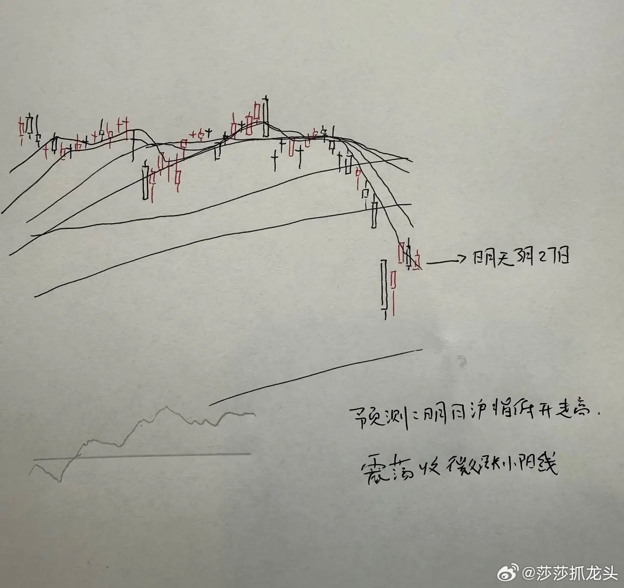 所以综合以上几点分析,对于明天市场的走势,莎莎认为明天市场有望走出一颗反弹的小阳线。那么明天A股到底怎么走?大家请看下图——关于明天走势的手绘预测图。