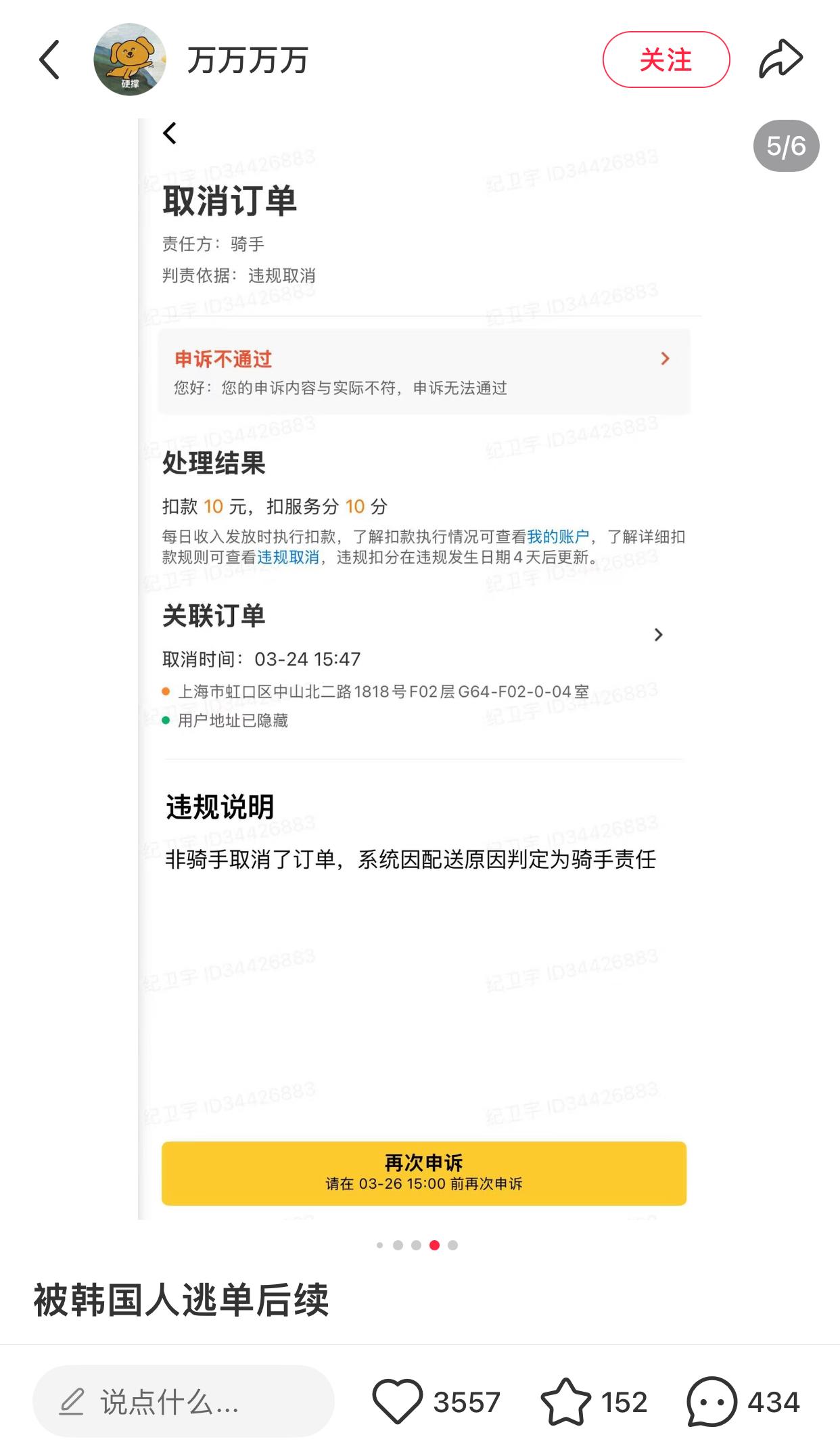 近日,网友爆料,韩国人在上海下单帮买,之后逃单! 骑手接到订单后,没有和对方沟通,不知对方是外国人,等订单送达后,联系不上对方,酒店又不让外卖进,于是机器人送上去! 可等了好久,对方都没付款,等骑手再次折返回酒店后才得知是韩国人,对方已经退房走了,要了对方电话号码后,因不懂韩语,请求网友帮助,但还是联系不上对方! 之后客服建议取消订单,结果骑手又被扣10元和10服务分,次日再联系客服才退回10元… 心疼博主,下雨天的送,结果被白嫖,发帖还遭到质疑怎么知道是韩国人的…[捂脸]
