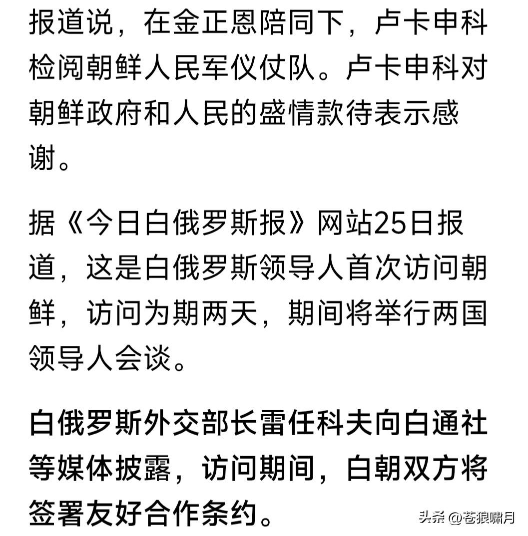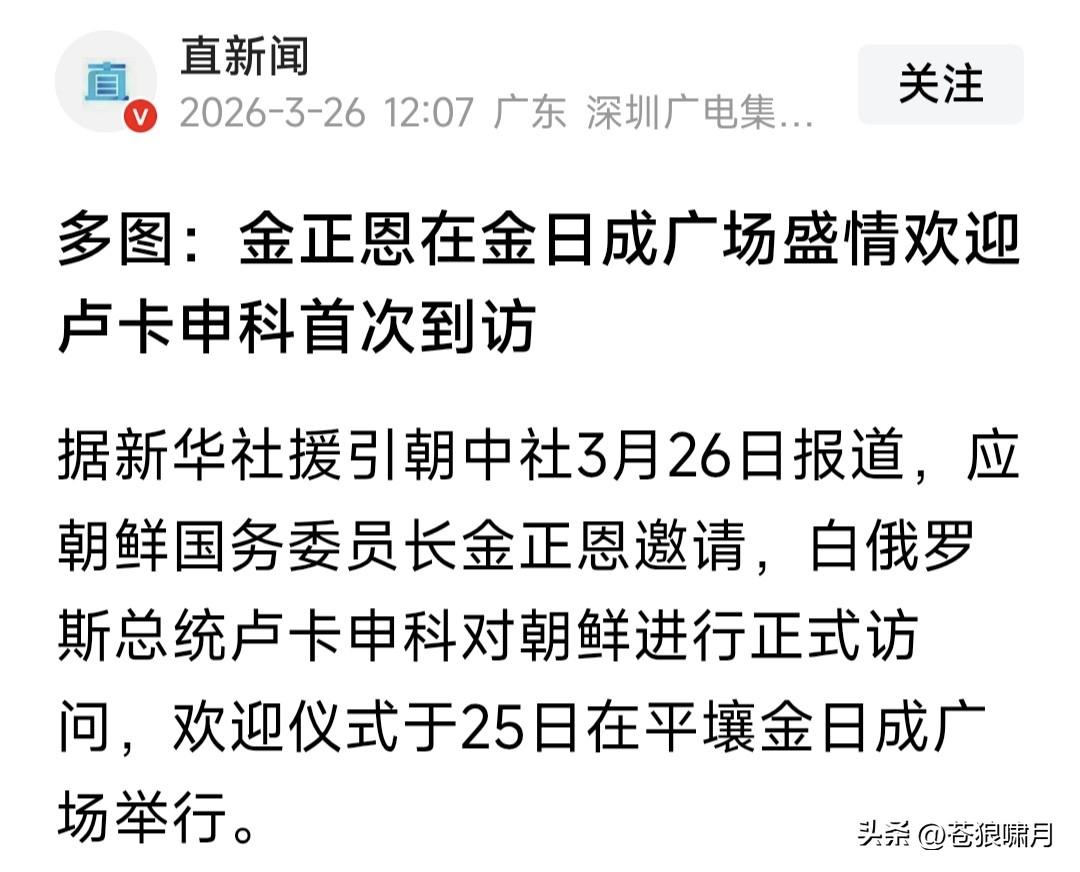卢卡申科访问半岛北方,场面壮观宏大令人十分震撼!这是白俄领导人首次访问平壤,媒体报道称,两国元首将举行会谈,并将签署友好合作条约。 苍狼有点不理解的是,在半岛北方刚刚宣布南方为“头号敌国与最敌对国家以及永远的敌人”之时,卢卡申科便访问平壤,是什么意思?奉谁旨意? 当前世界正处敏感时刻,“俄乌”与“以哈”以及“美以伊”,三场战争硝烟弥漫僵持不下,谁胜谁负决定世界走向:前进或后退?老卢此举用意何在? …………