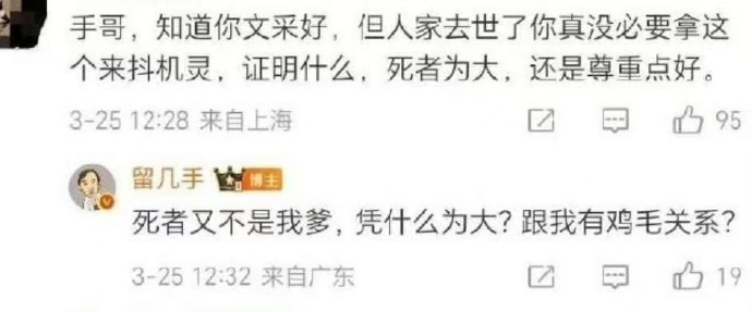 留几手在全网哀悼的肃穆氛围中,发文“东北网红数量减一”暗讽张雪峰老师离世,被网友规劝后更恶语回怼“死者又不是我爹,凭什么为大”,此举遭全网炮轰、账号被禁止关注,实属咎由自取。这场风波的核心,从来不是“言论自由”,而是对逝者的尊重、对生命的敬畏,更是对流量至上歪风的抵制。
