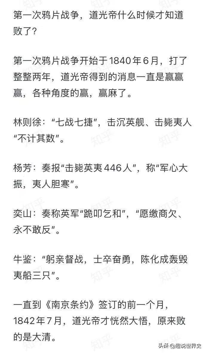 鸦片战争时,满清道光皇帝居然两年间听到的都是前线大胜的捷报,直到要被迫签订割地赔款的《南京条约》前一个月,才知道“一直赢”原来是慌报🤔