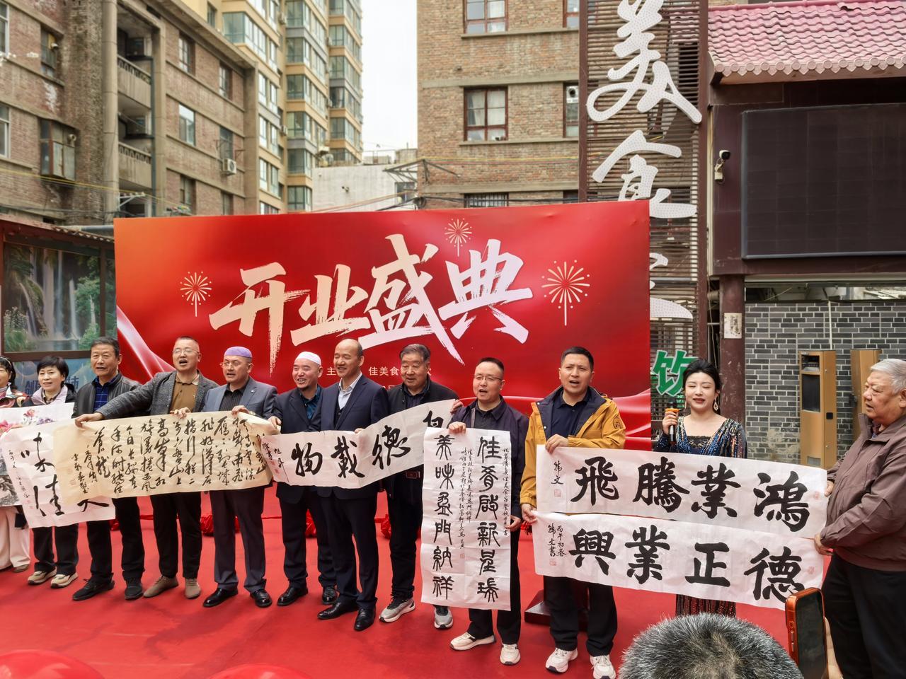 之后,甘肃毛体书法研究会负责人、及多位清真餐饮届老板上台,他们分别做了热情洋溢的发言,祝贺佳美食家餐饮店开业,祝贺生意红红火火,并走向全国走向世界。
