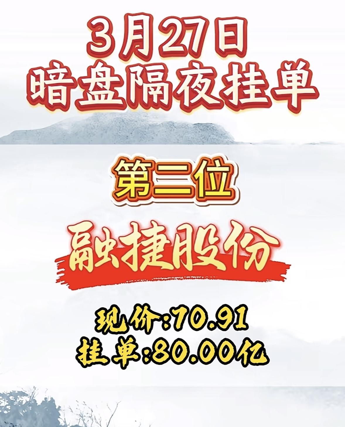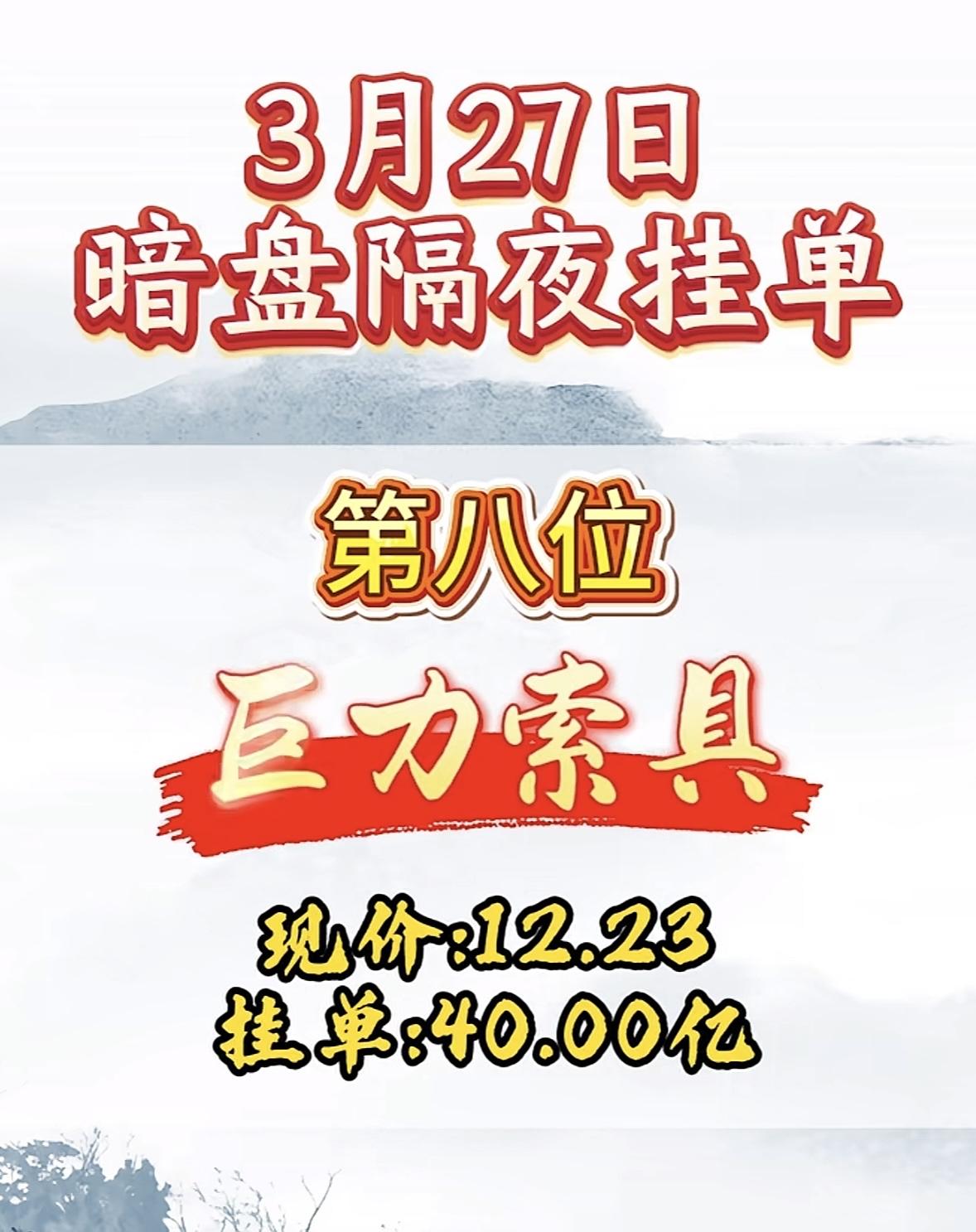 3月27日周五暗盘隔夜挂单排行榜揭晓 3月27日暗盘隔夜挂单这事儿挺刺激啊。巨力索具现价12.23,居然挂单40亿,这手笔可不小。这40亿的挂单,就像一颗重磅炸弹,不知道会在市场上掀起多大的风浪。要是这单成了,说不定股价能蹭蹭往上涨,让不少人赚得盆满钵满;可要是没成,那也得影响不少股民的心情。这就跟赌博似的,充满了不确定性。也许背后有大资金在布局,也可能只是有人想试探市场反应。不管怎样,接下来巨力索具的走势值得好好关注一下。