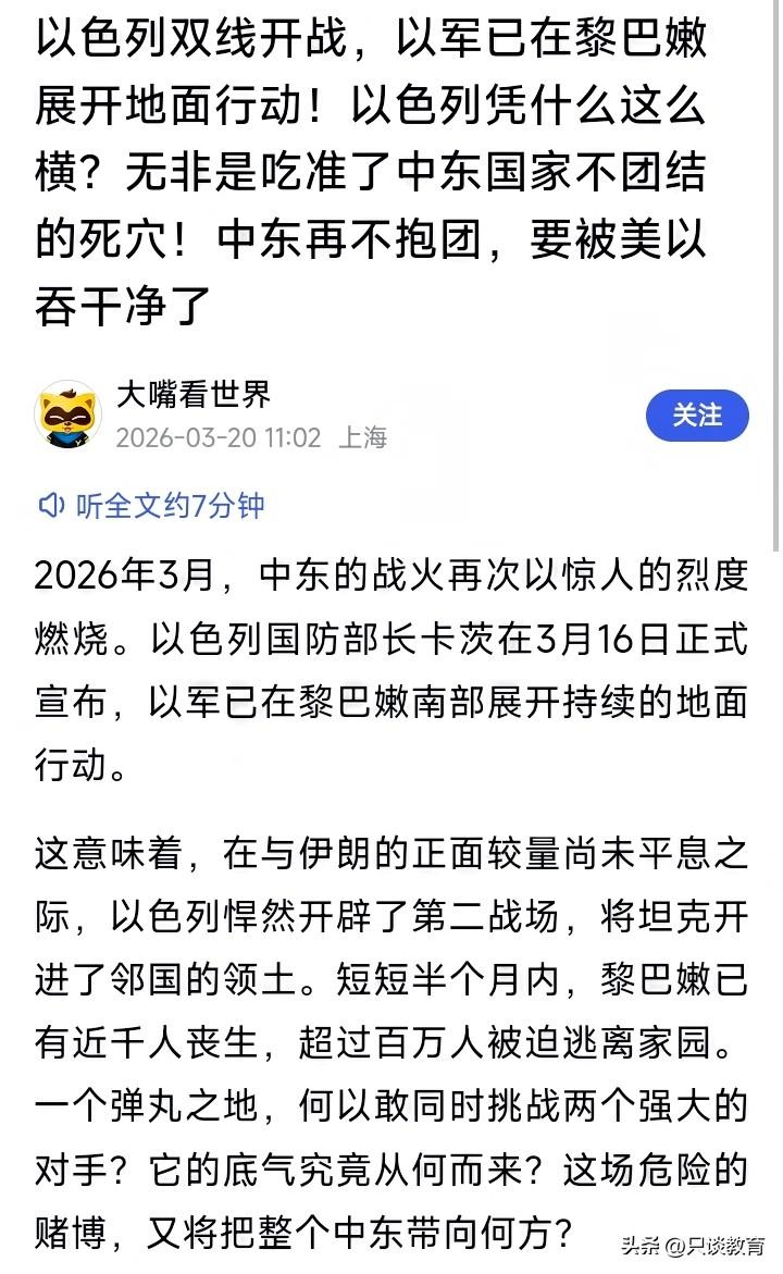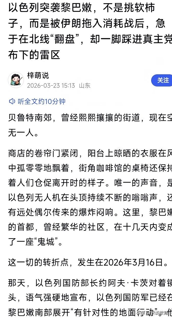 以色列的真实战略目标可能是黎巴嫩, 很多人可能都搞错了! 刚开始美以联军对伊朗的斩首行动, 都认为是以色列撺掇美国去干的。 但现在看来,恰恰相反, 美军才是主动的一方。 为什么这样说?那请你思考一下吧! “真实承诺-4”都已开展第80轮了, 以色列几乎每天都要挨伊朗的导弹。 然而,以色列现在在干什么呢? 不是反击伊朗,也没加强轰炸, 而是地面攻击其邻国黎巴嫩北部。 以色列表面上是在和伊朗作战, 但实际上依然是想对付“宿敌”真主党。 真主党与以色列有何过节? 当年以色列侵占黎巴嫩北部领土, 伊朗有力支持了黎巴嫩反侵略组织, 也就是真主党。 为此,伊朗与以色列也由此结了仇。 以色列内心的算盘是这样的: 利用美国死死拖住伊朗, 让其无法对“抵抗之弧”有任何军事援助。 自己好抽出身来去打击黎巴嫩真主党,从而占领黎巴嫩北部领土。 以色列想要成为真正的中东小霸王, 如果没有足够的国土面积和战略纵深,那就无异于白日做梦。 此时,叙利亚也该有所行动了! 否则,如果伊朗服软,真主党败了, 下一个目标无疑就是它了。 大家认为我分析得有无道理? 喜欢军事的朋友们, 咱们来评论区留言讨论一番吧! 中东局势升级 伊以冲突升级 伊朗 以色列 以色列宣布进入战争状态