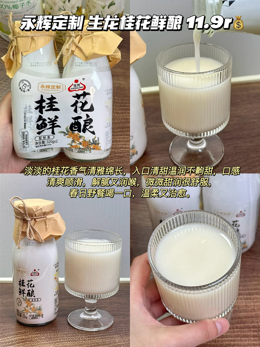 2️⃣ 永辉定制 生龙桂花鲜酿:桂花香气醇厚,口感清甜解腻,野餐微甜小饮超适配。入口温润顺滑,桂花香淡雅绵长,甜度恰到好处,解腻又润喉,和甜品、小吃超搭,春日氛围感十足。