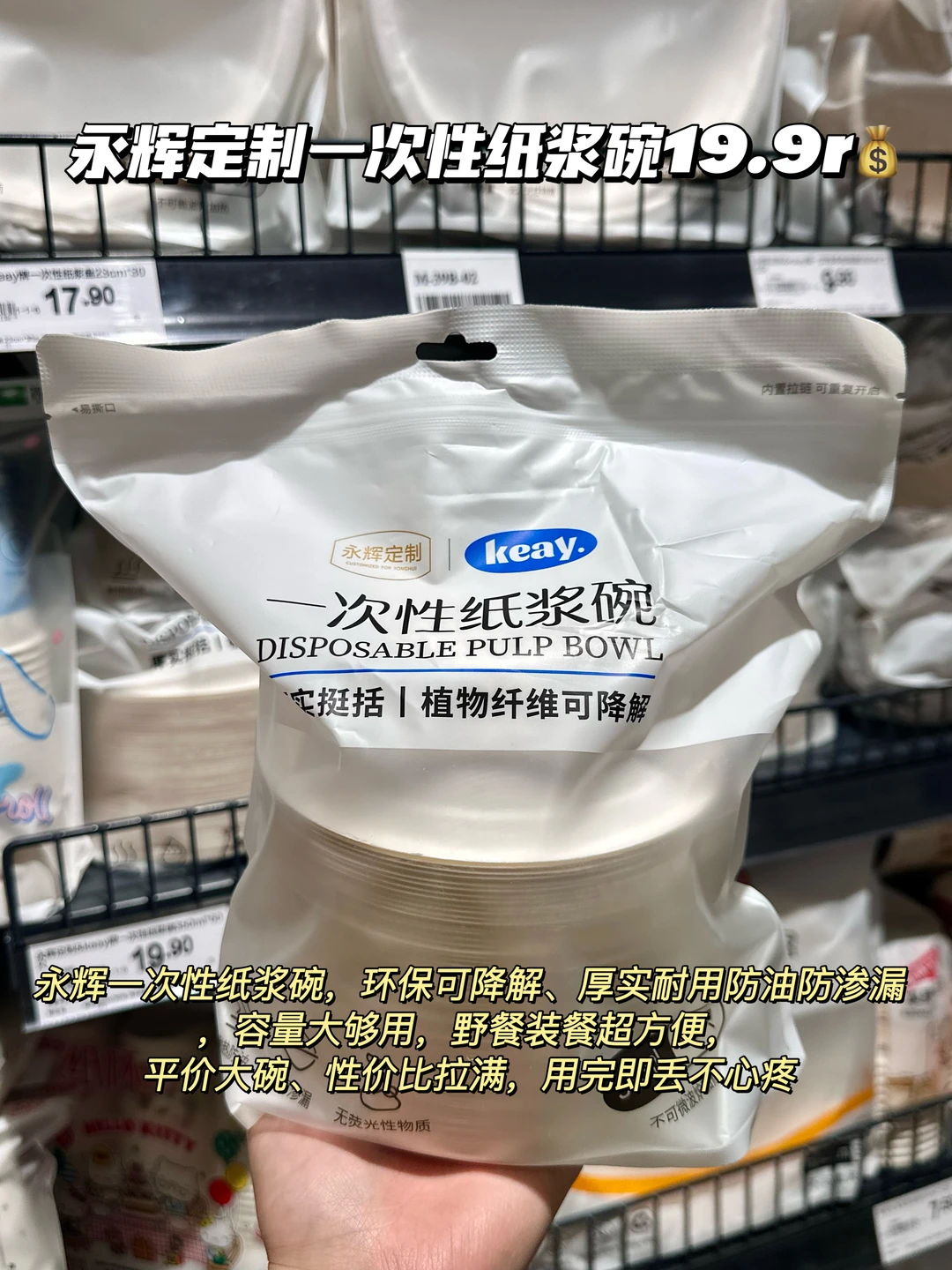8️⃣永辉定制一次性纸浆碗350ml*60只:环保可降解、厚实耐用不渗漏,容量够用,野餐装水果、小吃超方便,量大实惠、性价比超高,平价好用,用完即丢超省心。
