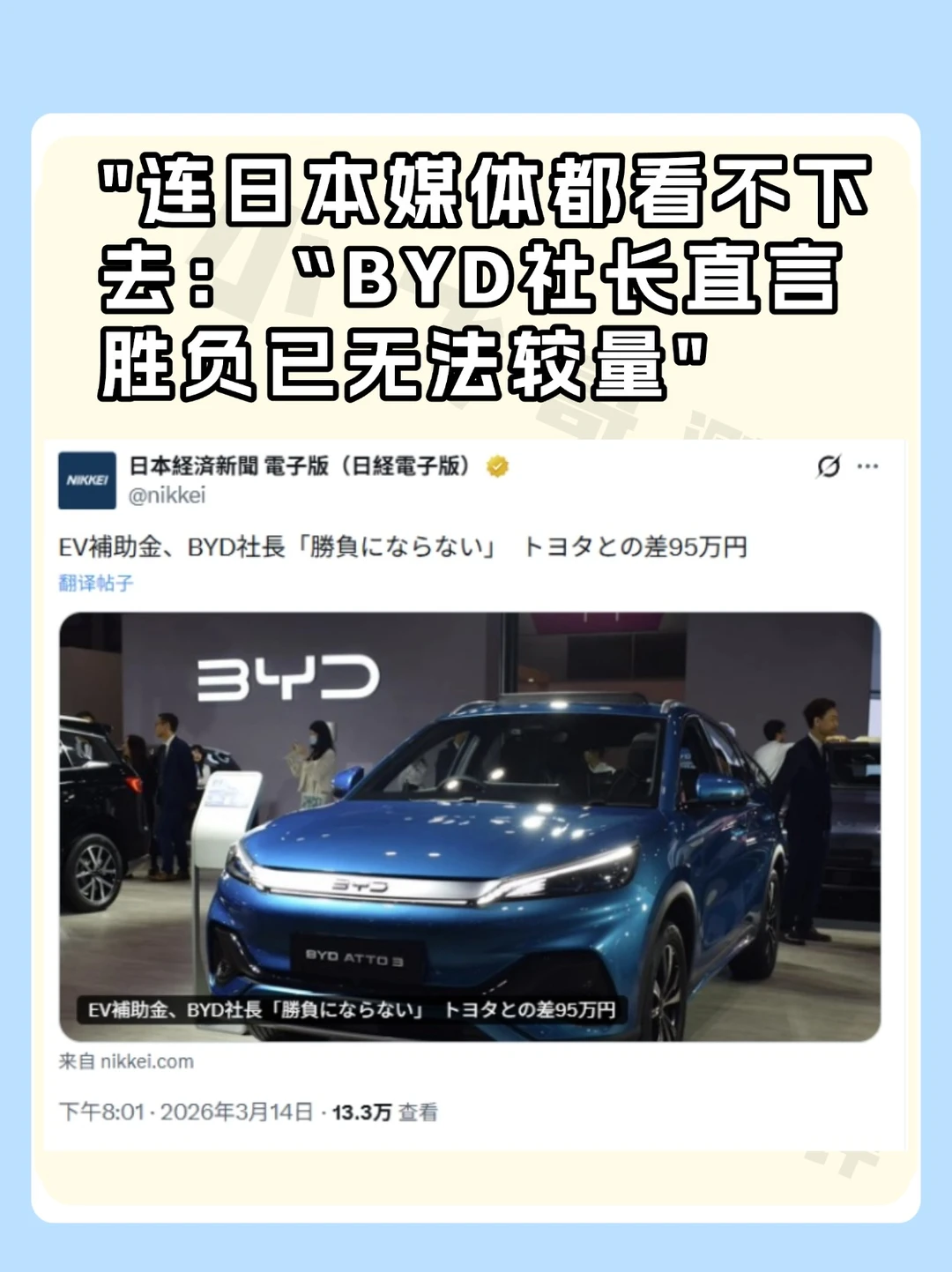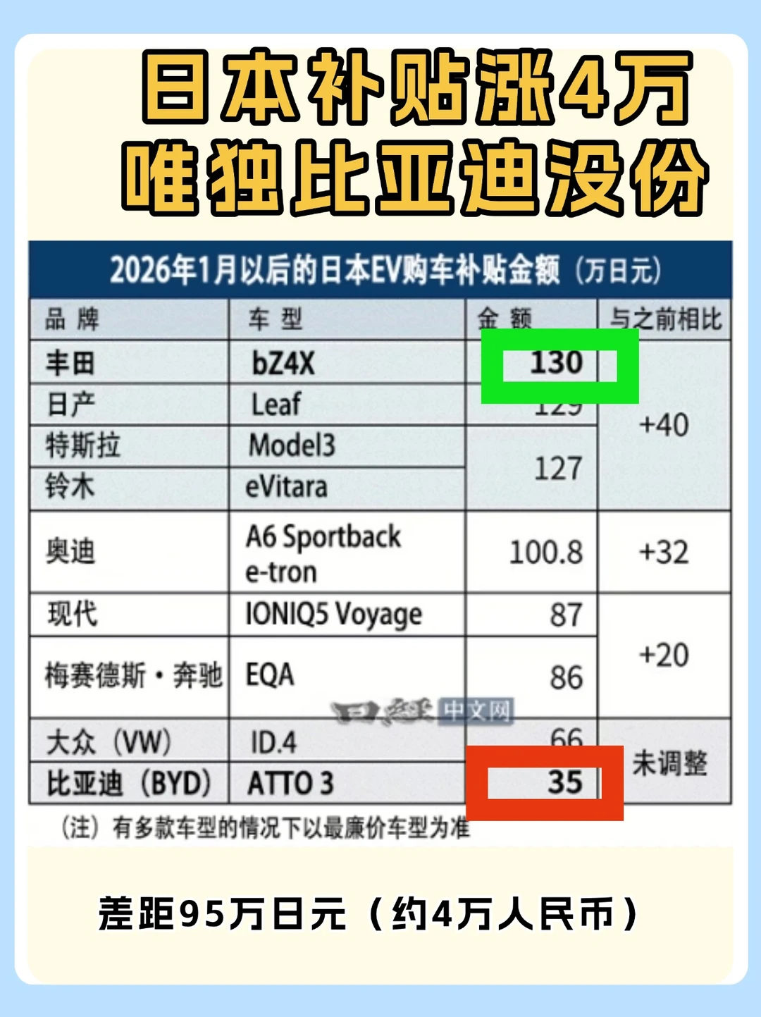说是"普惠",结果成了"排他"——丰田、特斯拉补贴直接飙到130万日元,比亚迪ATTO 3愣是一分钱没涨,卡在35万日元...这差距足足95万日元(约4万人民币)!